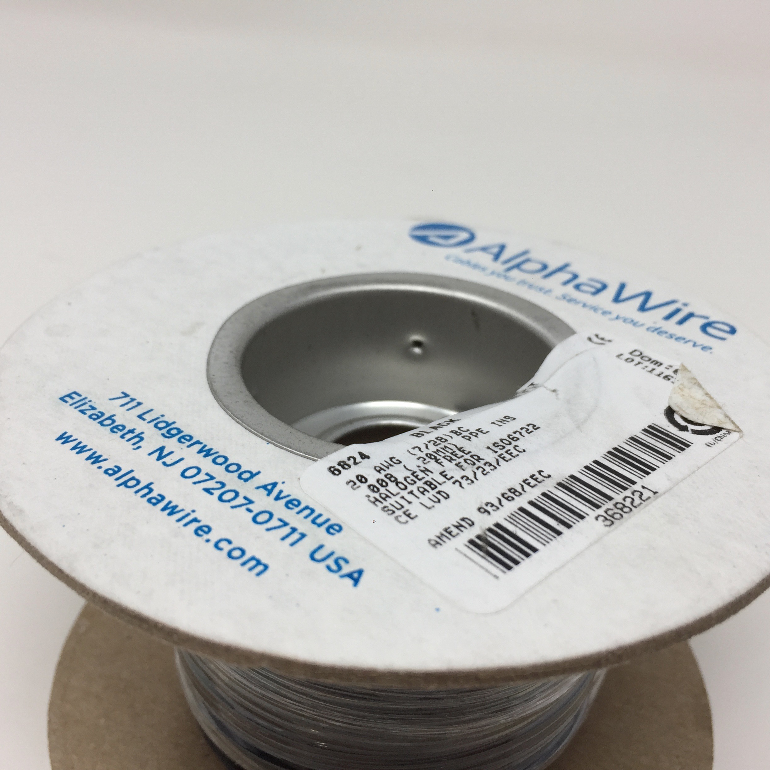 6824 BK005 Alpha Wire | 300V Hook-Up Wire Total Stock: 1 Factory Lead Time: TBD RoHs Compliant ECOWIRE PLUS, 6824 BLACK 100 FT 20AWG 7/28 BC $84.835 Quantity Min: 1 Mult: 1