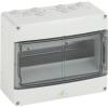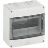 The AK Series are small to large enclosures designed to house and protect standard IEC components, such as DIN rail mount circuit breakers, switches, meters and other control devices. Larger than the EK Series, they offer increased capacity for mounting components and provide additional space for more convenient wiring. The unique cover design features a shrouded cut out and transparent hinged doors for quick access and visibility. The shrouded cut out, spanning the width of the cover, exposes mounted components for easy adjustment while isolating wiring for increased safety. Doors have push release latches with reversible hinge feature to open from the left or right side. Keylocks can be added to the doors for increased security. Most enclosures are supplied with removable terminal strip assemblies for ground / neutral distribution and DIN rails. Equipped with pre-installed entry plugs, these enclosures provide IP65 protection. Use of appropriate sealing connector assemblies for wire, cable or conduit entry can maintain IP65 protection. Using the entry spouts provided, enclosures have IP54 protection. • Direct mount • Corrosion and maintenance free • Small to large size • Polystyrene or Polycarbonate base and cover • Polycarbonate transparent doors • Integral seals • High mechanical strength • Dust and moisture proof • Halogen free • Up to IP65 protection