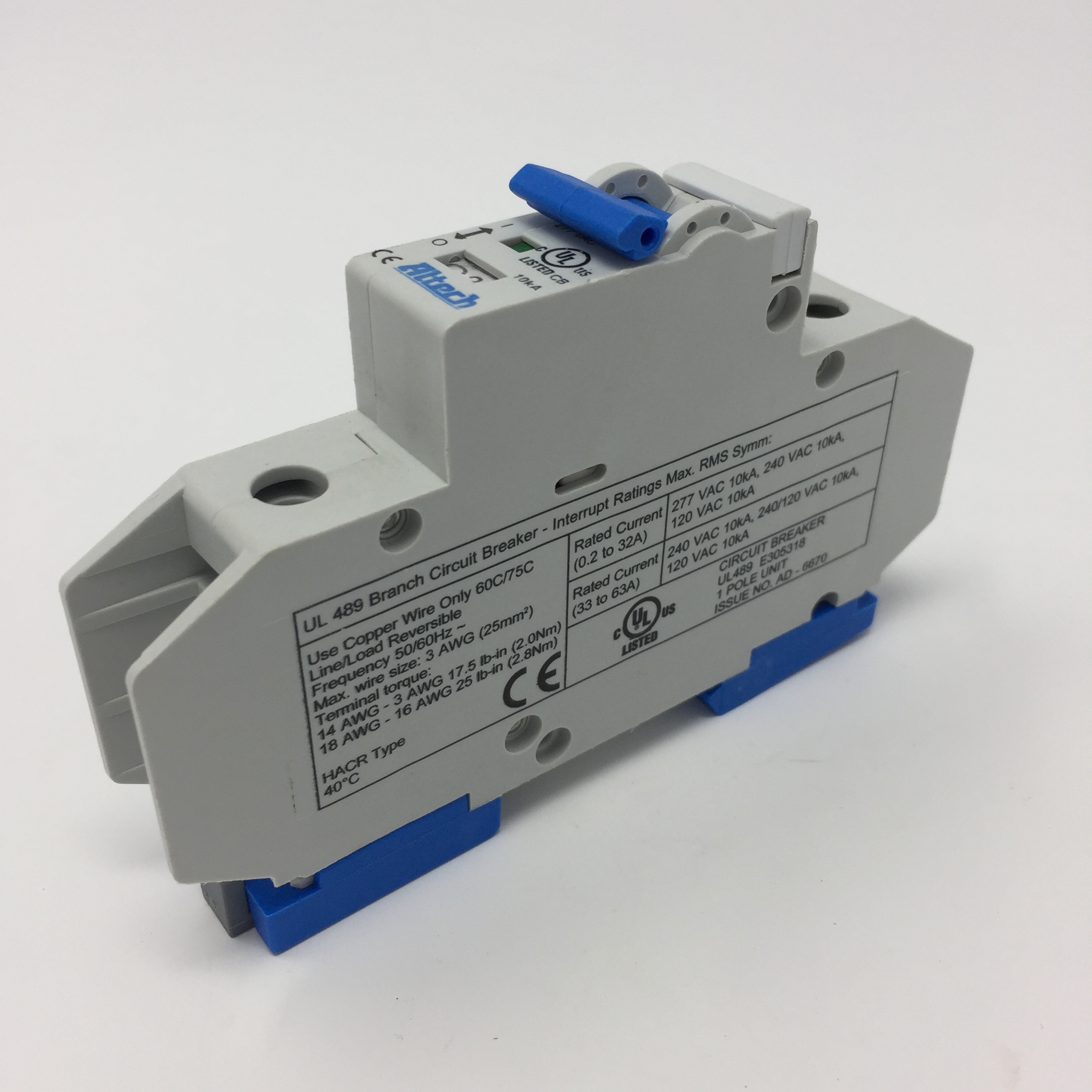 Altech UL489 Din Rail Miniature AC 1 Pole Circuit Breaker. Rated at 25 Amps with a C Trip Curve