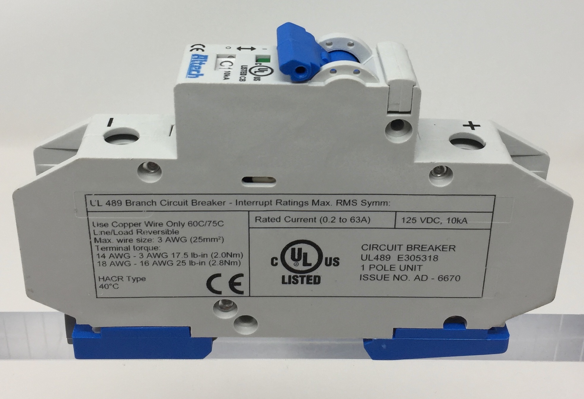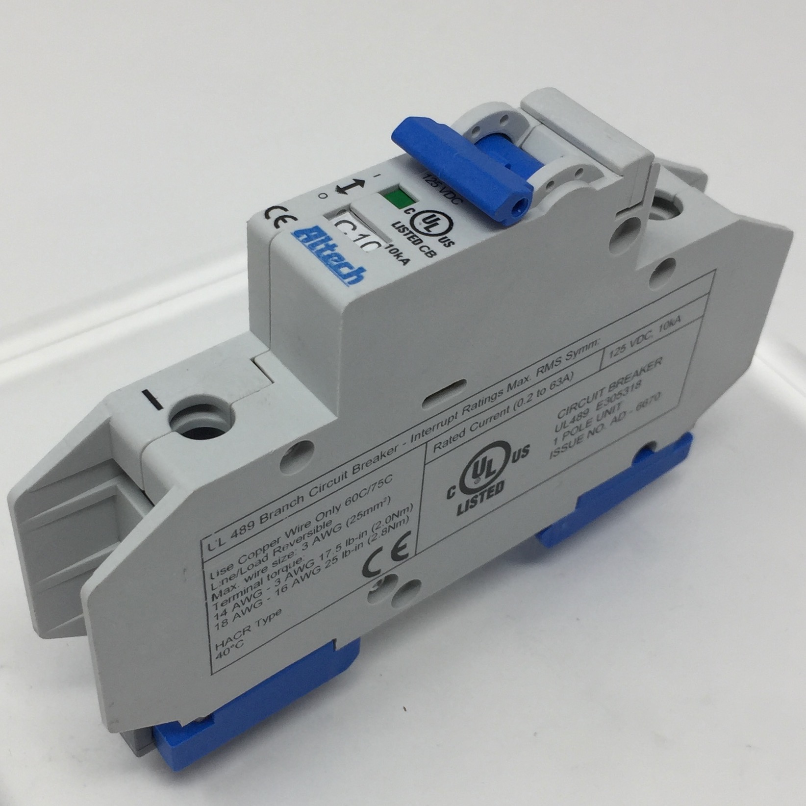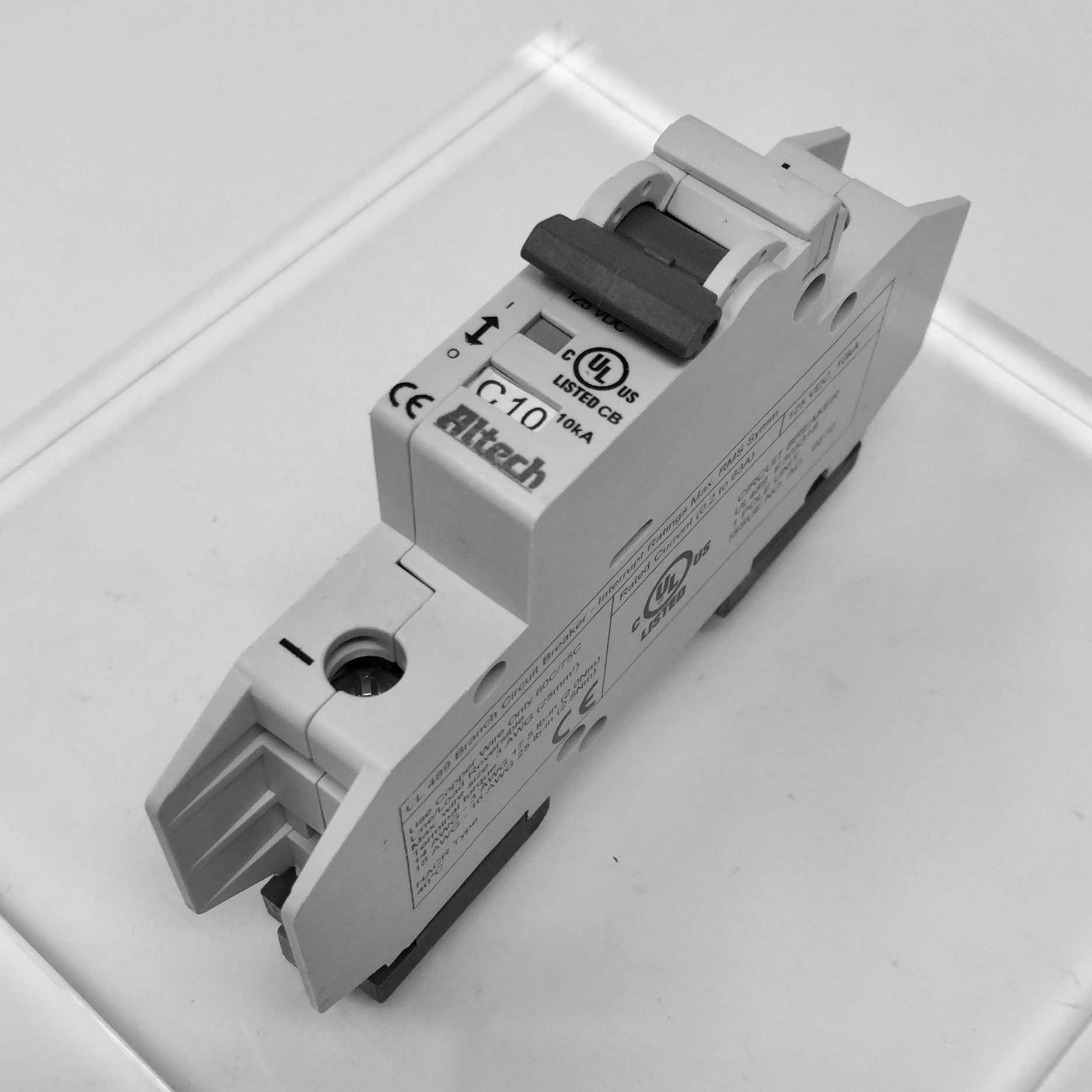 Altech UL489 Din Rail Miniature DC 1 Pole Circuit Breaker. Rated at 10 Amps with a C Trip Curve
