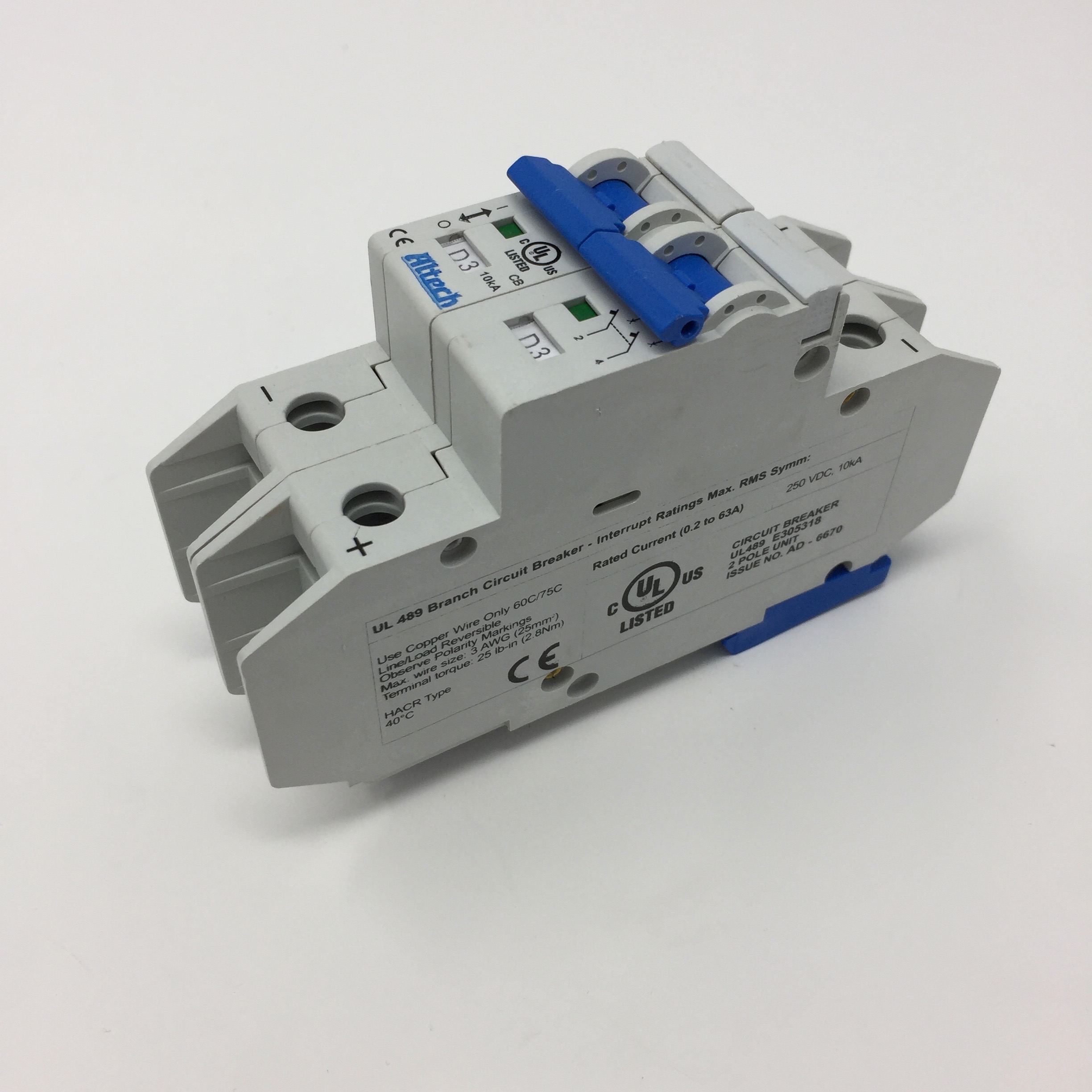 Altech UL489 Din Rail Miniature DC 2 Pole Circuit Breaker. Rated at 3.0 Amps with a D Trip Curve