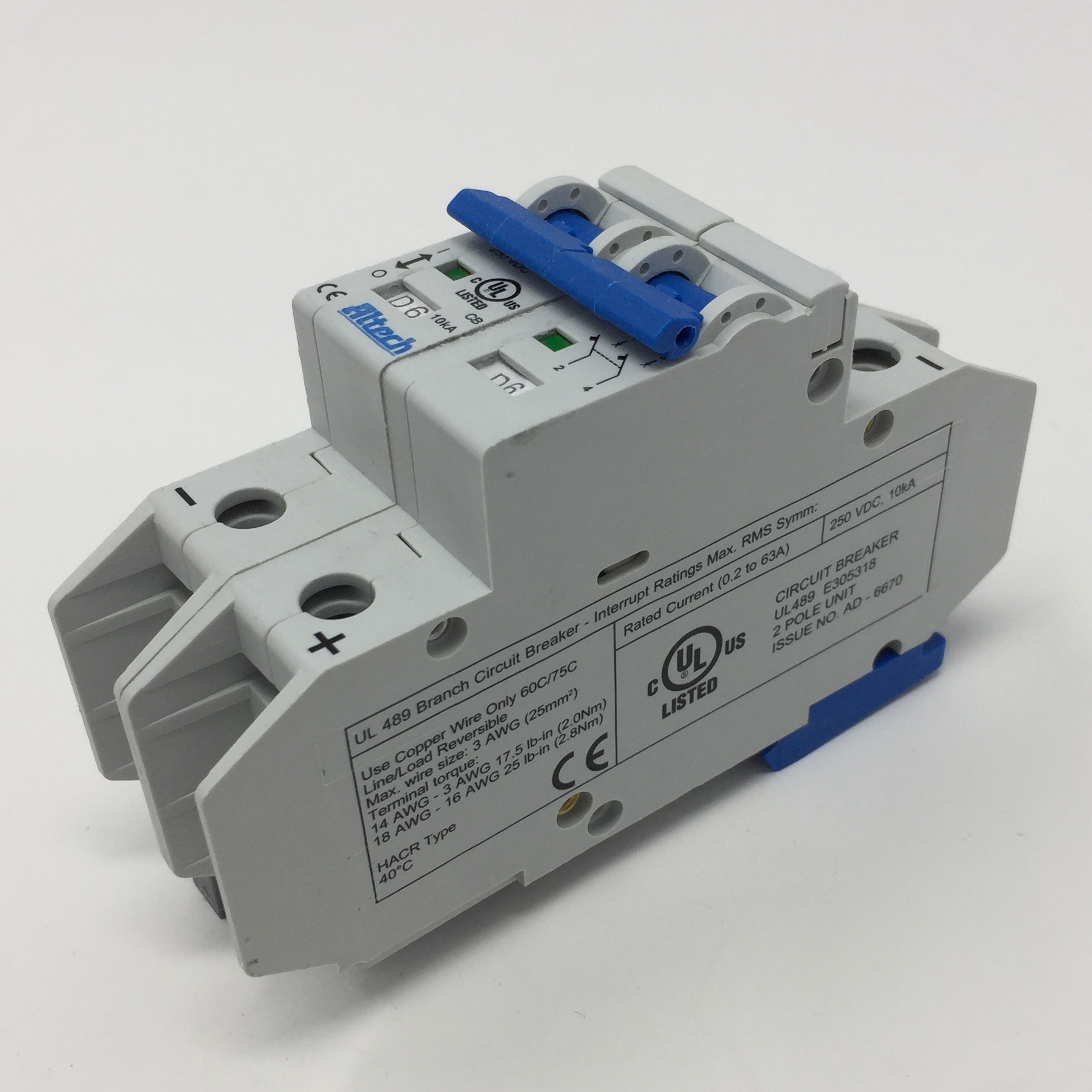 Altech UL489 Din Rail Miniature DC 2 Pole Circuit Breaker. Rated at 6.0 Amps with a D Trip Curve