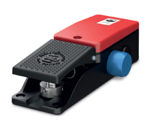 Altech Enabling Foot Switch without Cover. The enable foot switch provides two enabling contacts and one signaling contac and is available with or without latch. If the pedal is pressed up to pressure point, the two enable contacts are closed. If the pedal is released, the enable contacts are open again. If the pedal is pressed past the pressure point, to the bottom position, the positive opening ation enabling contacts are opened. When the pedal is released from the bottom position, the enabl