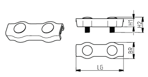 Altech Cable Clamps, Cable, Springs, Turnbuckles & Pulleys. Cable grip, duplex With [LG - 40 mm] and [BR - 17 mm] and [H1 - 7 mm].