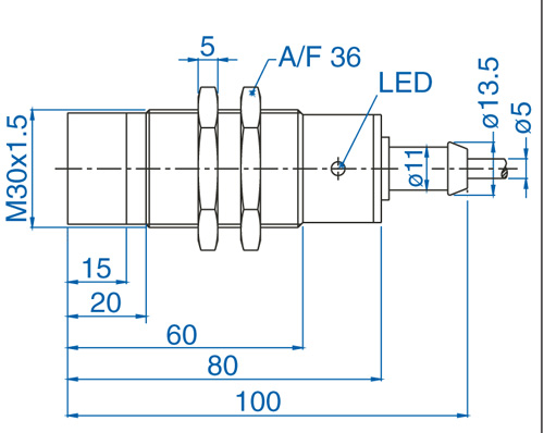 LED for Output Energized. M30 Non-Flush Mount. Fixed Cable