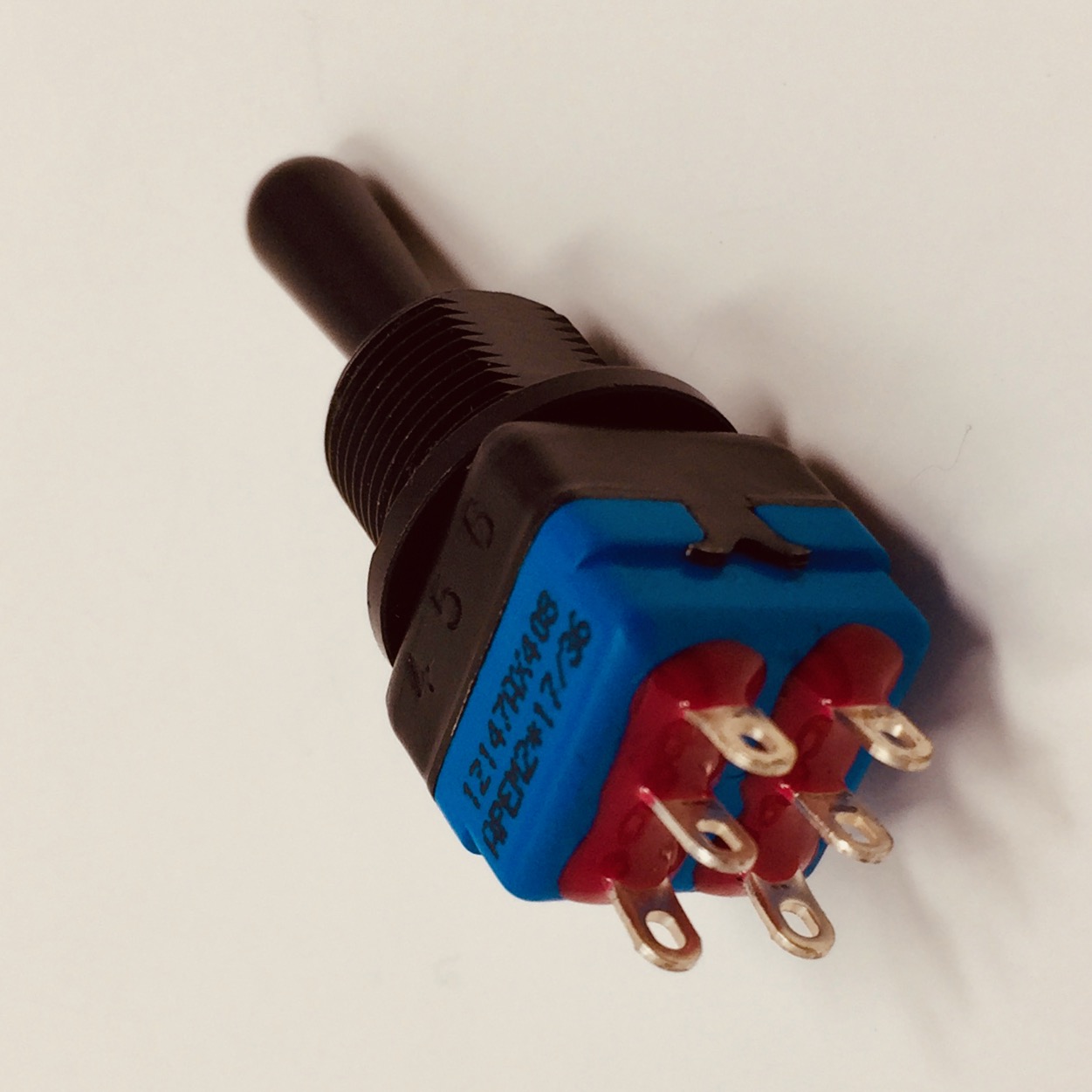 Apem 12000 Series Double pole (Mom) Off (Mom) Toggle Switch with Solder lug terminals and Silver contacts. Switch has a Black finish on Bushing, Actuator and hardware Finish.