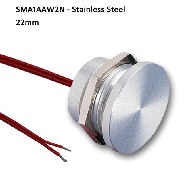 Stainless Steel 22mm Normally Open Natural Piezo Switch with Flat Face and rated at 0-24V 0.2A
