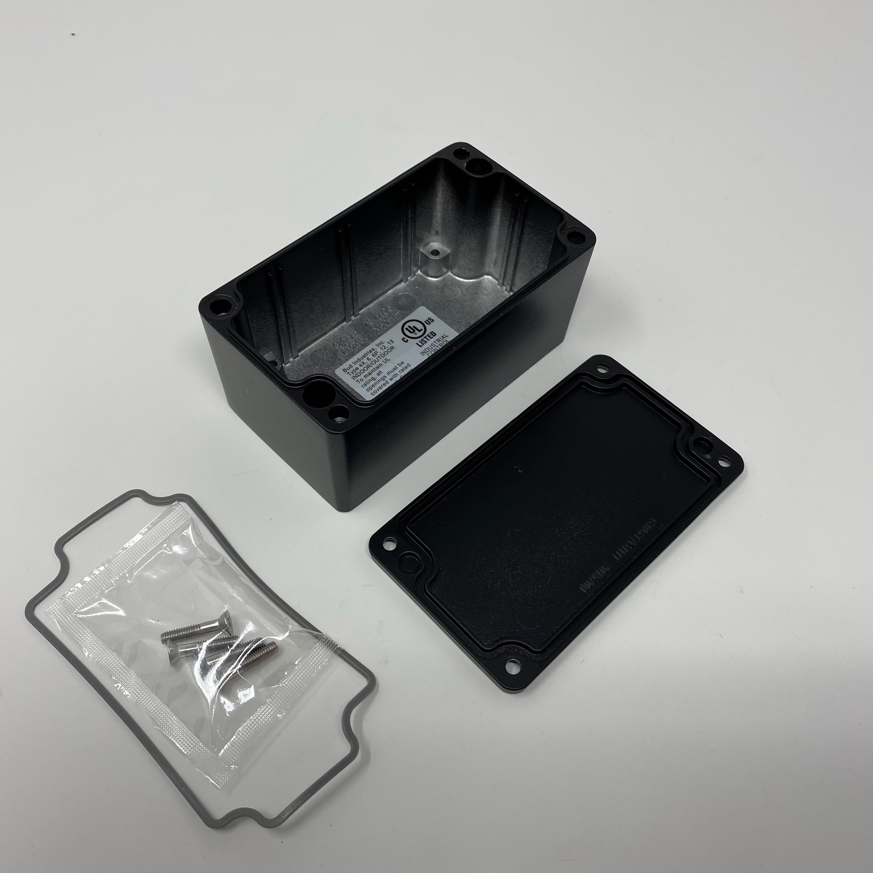 BUD 4.53" x 2.56" x 2.17" Aluminum Die Cast Standard Box in Black Smooth Powder Coat with premolded silicon gasket.