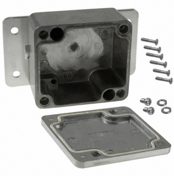 BUD 2.52" x 2.28" x 1.38" Aluminum Die Cast Box with Mounting Bracket in Natural Finish with premolded silicon gasket.