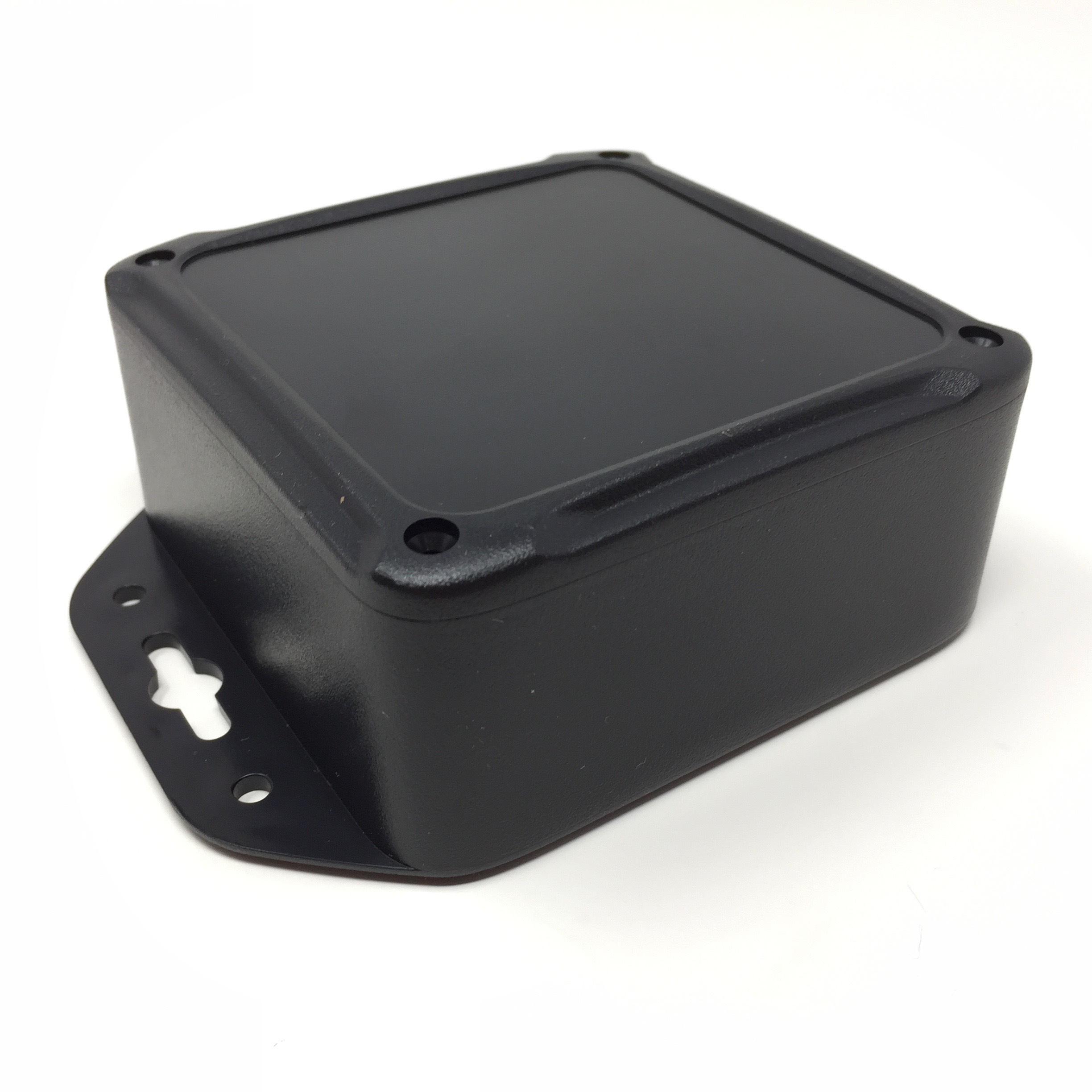 ABS black plastic enclosure Overall Dims 4.00 x 4.00 x 1.85 in. with molded mounting brakets