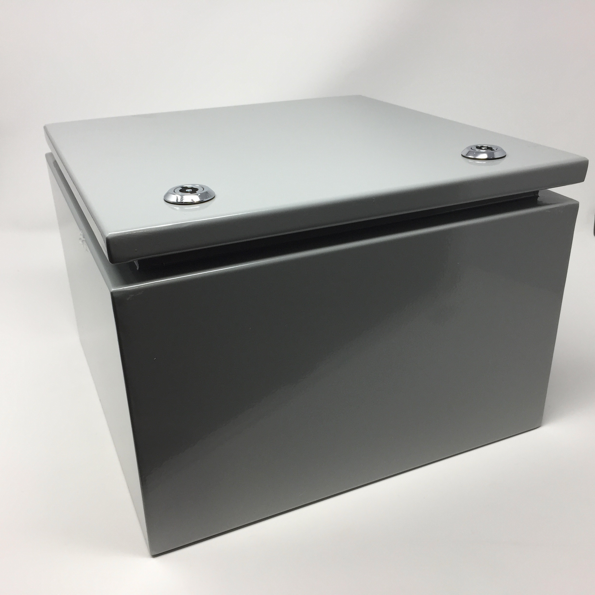 BUD NEMA 4 16 ga. steel 11.81 x 11.81 x 7.87 Enclosure, with hinged cover clamps to the base and keyed quarter turn latch for a watertight seal.