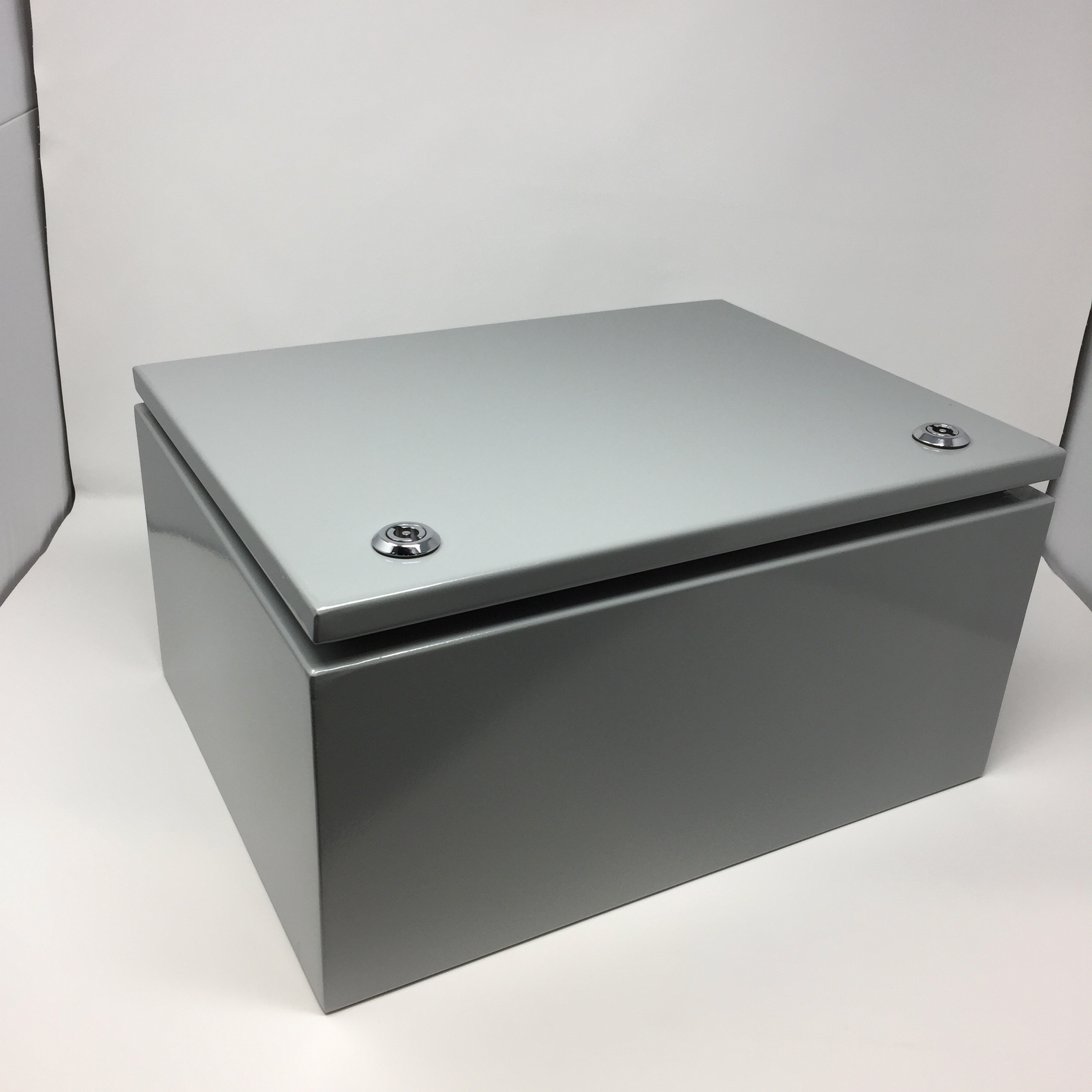 BUD NEMA 4 16 ga. steel 15.75 x 11.81 x 7.87 Enclosure, with hinged cover clamps to the base and keyed quarter turn latch for a watertight seal.