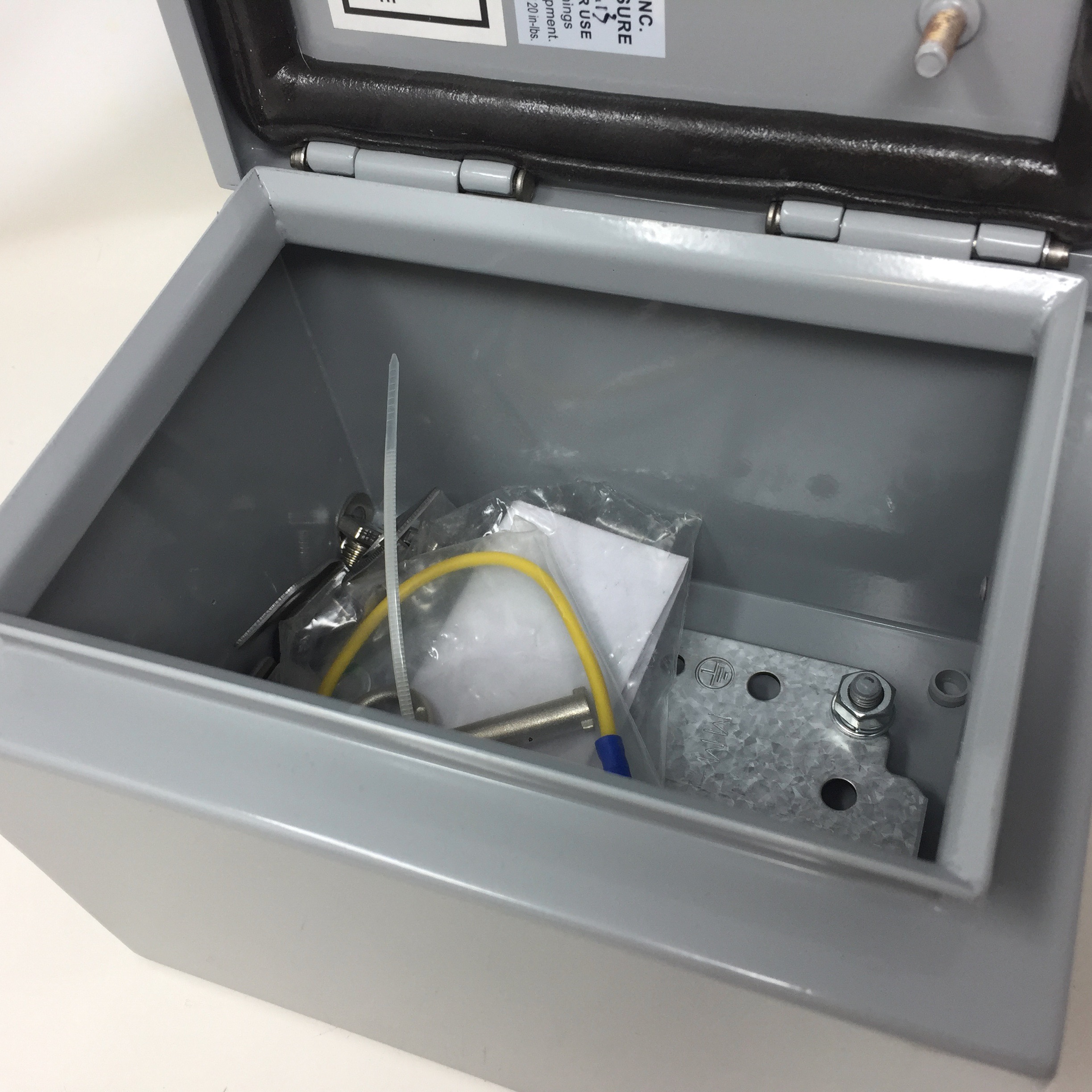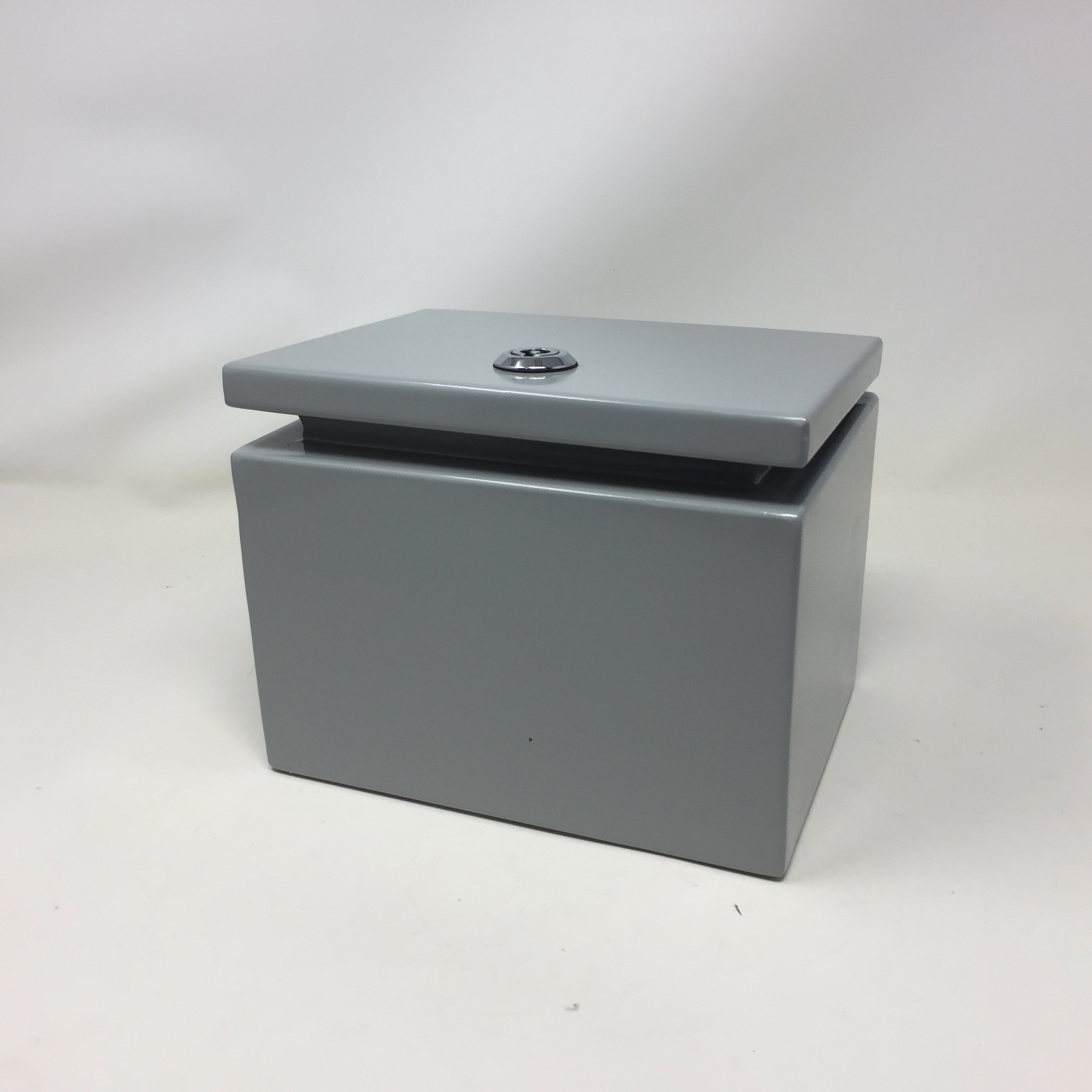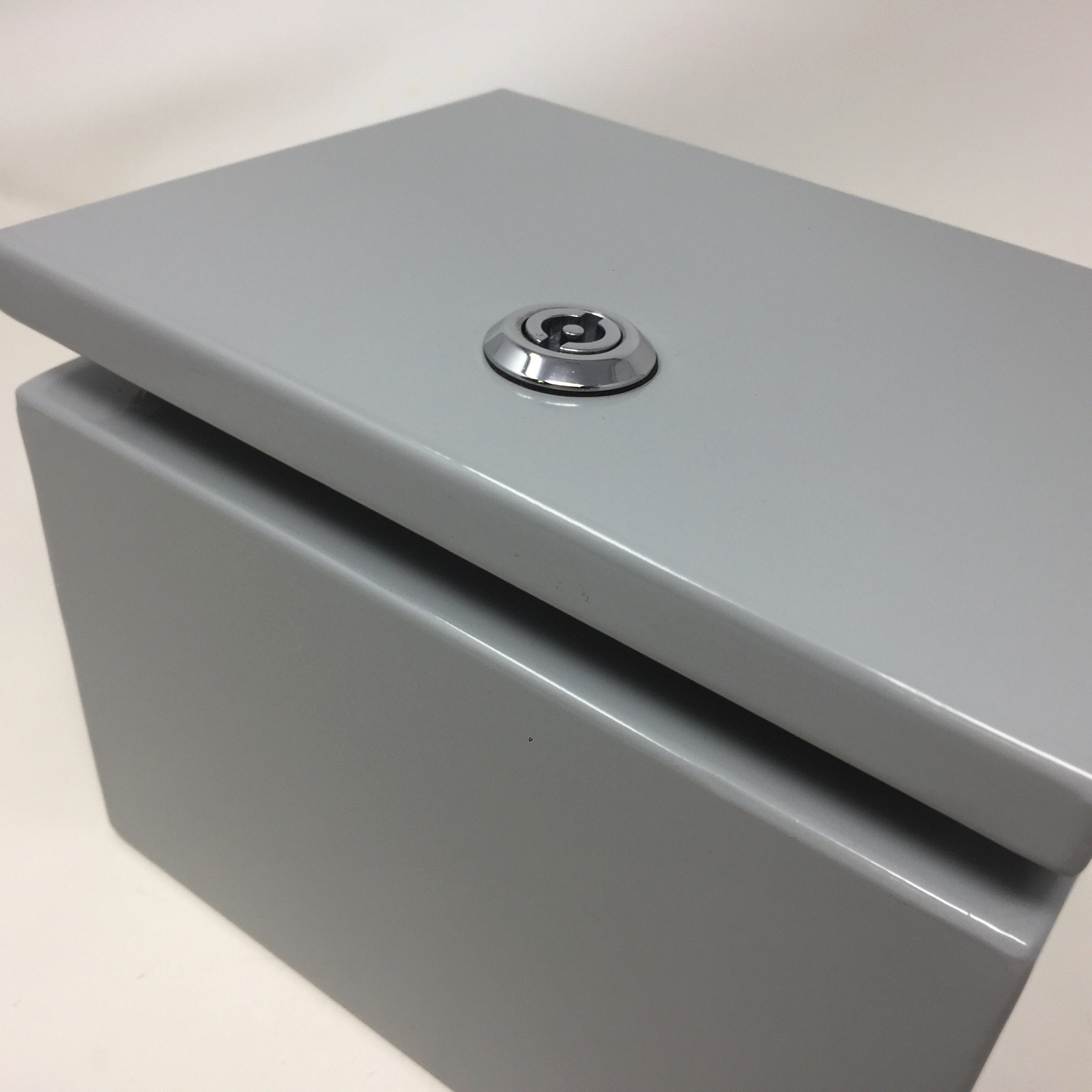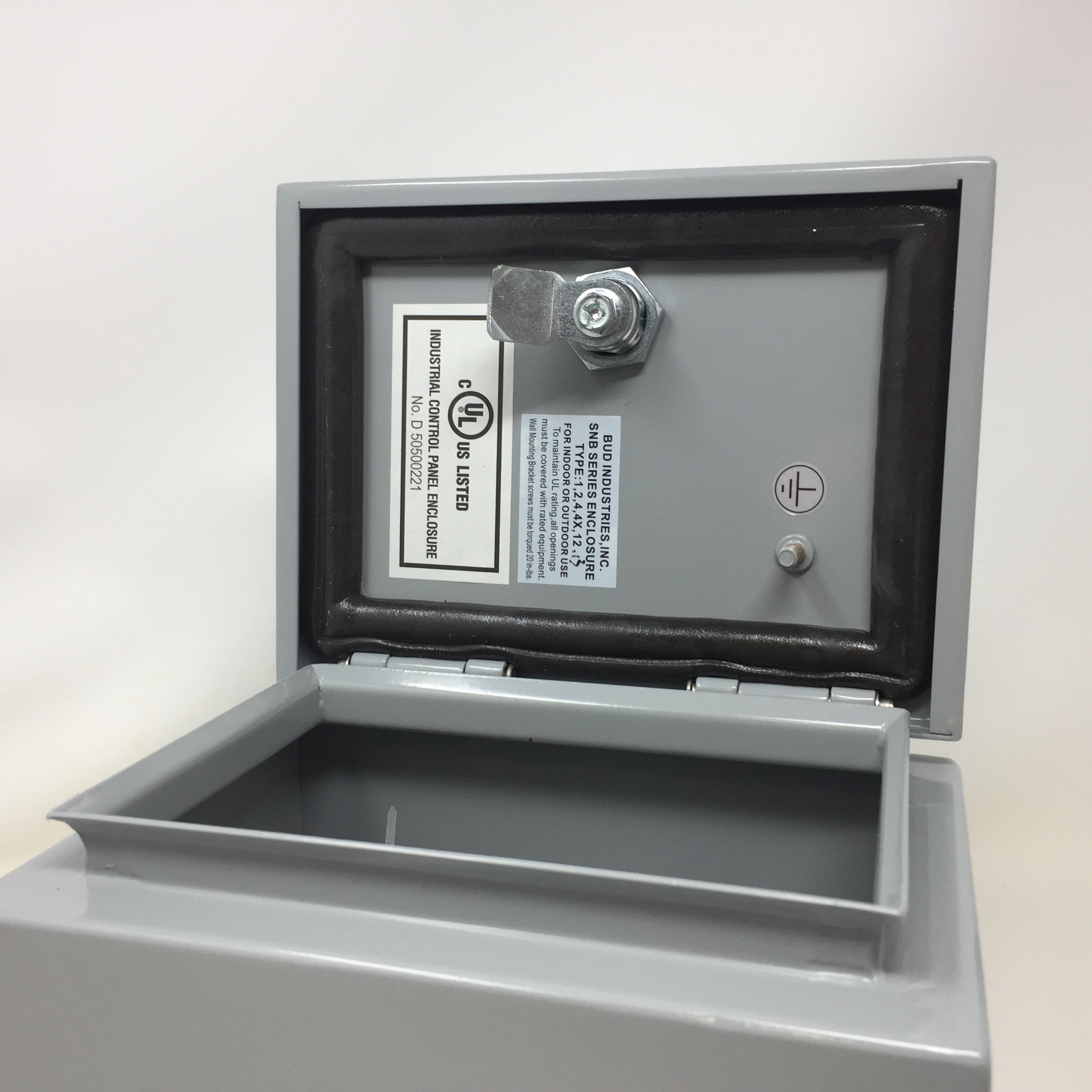BUD NEMA 4 16 ga. steel 7.87 x 5.91 x 5.91 Enclosure, with hinged cover clamps to the base and keyed quarter turn latch for a watertight seal.
