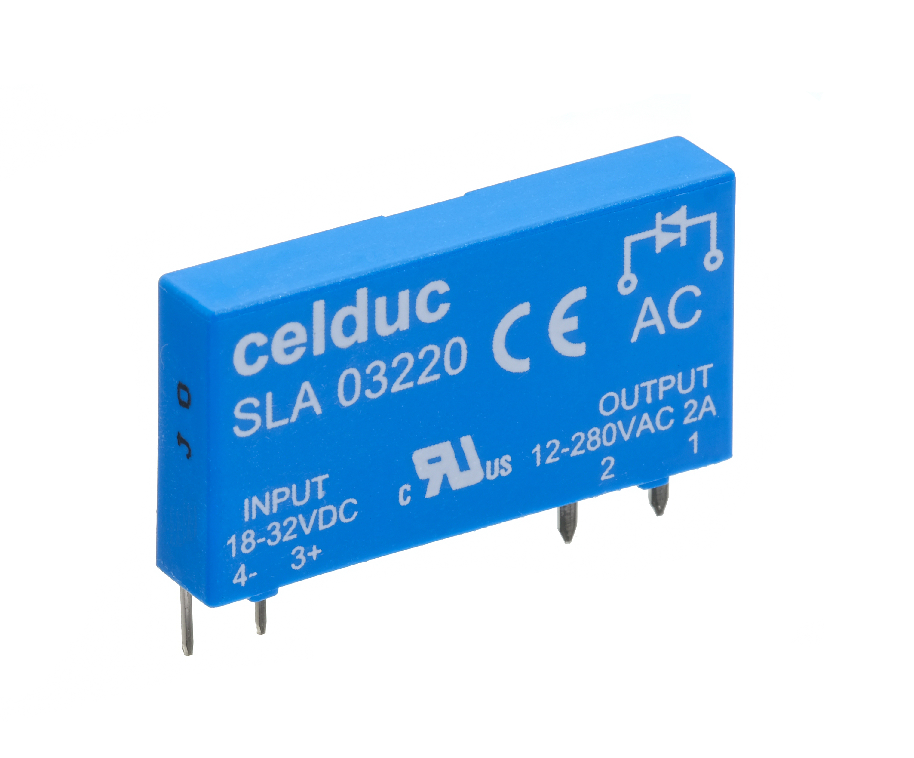 SSR 4A/32VDC/CTRL3-10VDC Configured with pin Terminals and Normally Open Contacts and PCB Housing with 3VDC - 10VDC @ 27mA Max . Celduc Part Number SLD01205