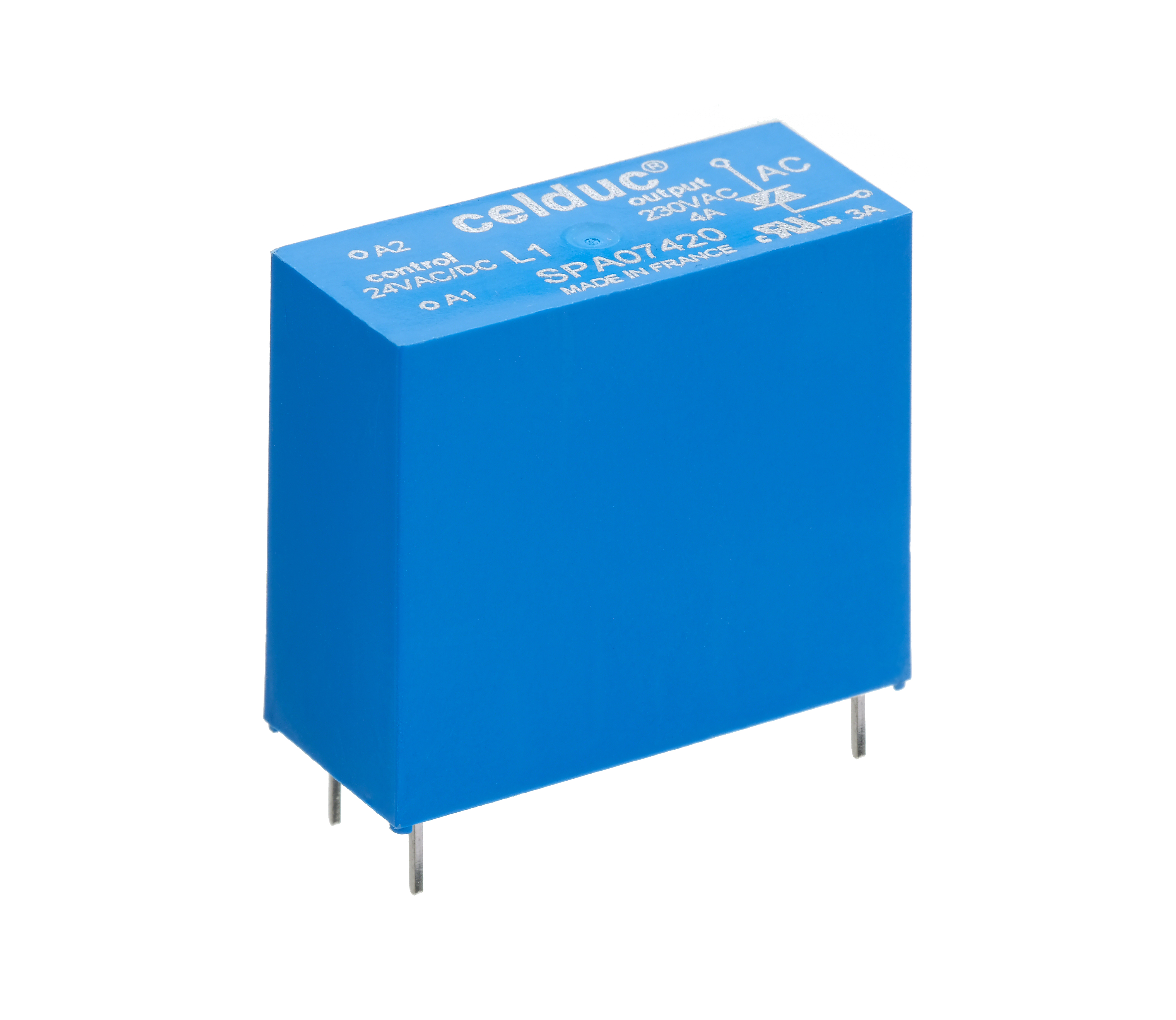 SSR 4A/230VAC/CTRL 24VAC/DC Configured with pin Terminals and Normally Open Contacts and PCB Housing with 1215VDC - 30VDC @ 1213mA Max . Celduc Part Number SPA07420