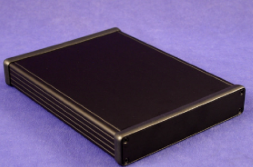 black extruded aluminum enclosure w/ metal end panels 165 X 30.5 X 220MM ALM EXT BK (8.66 x 6.5 x 1.22) Hammond PN 1455R2201BK : UPC [623980514796] Color: Black