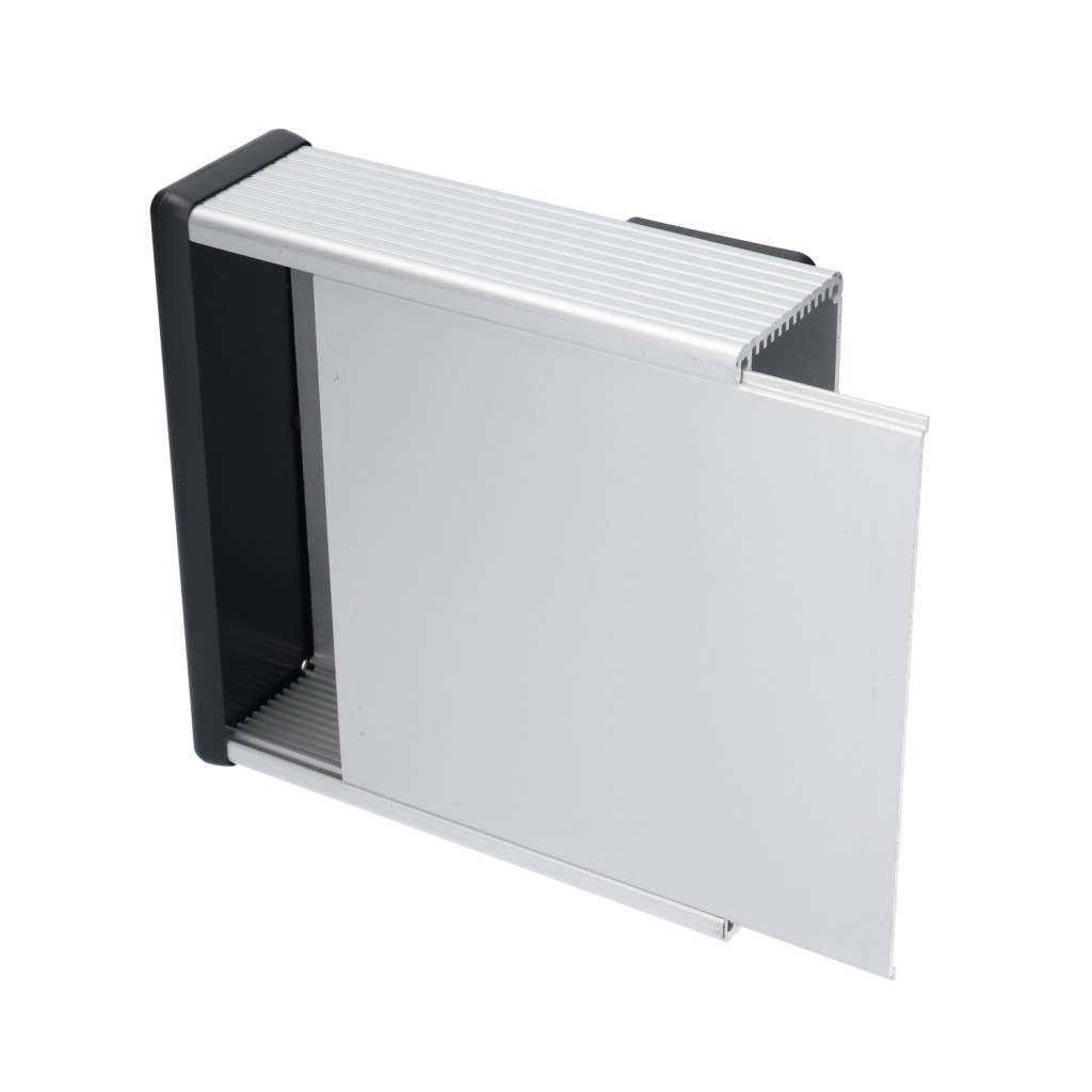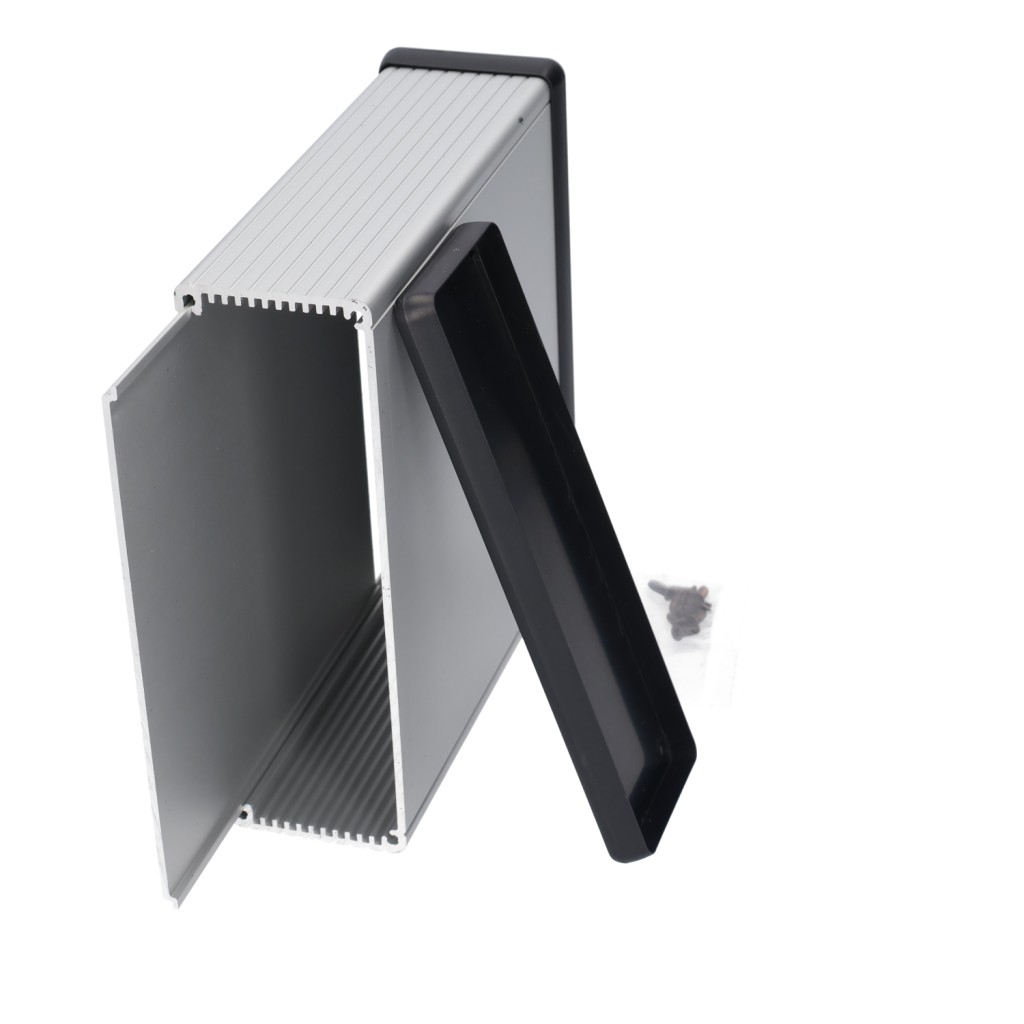 extruded aluminum enclosure w/ plastic end panels 165 X 50.5 X 160MM ALM EXTRUSN (6.3 x 6.5 x 2.05) Hammond PN 1455T1602 : UPC [623980514888] Color: Clear (Anodize)