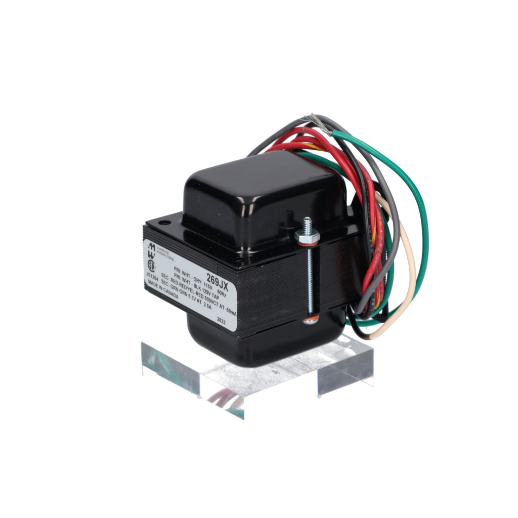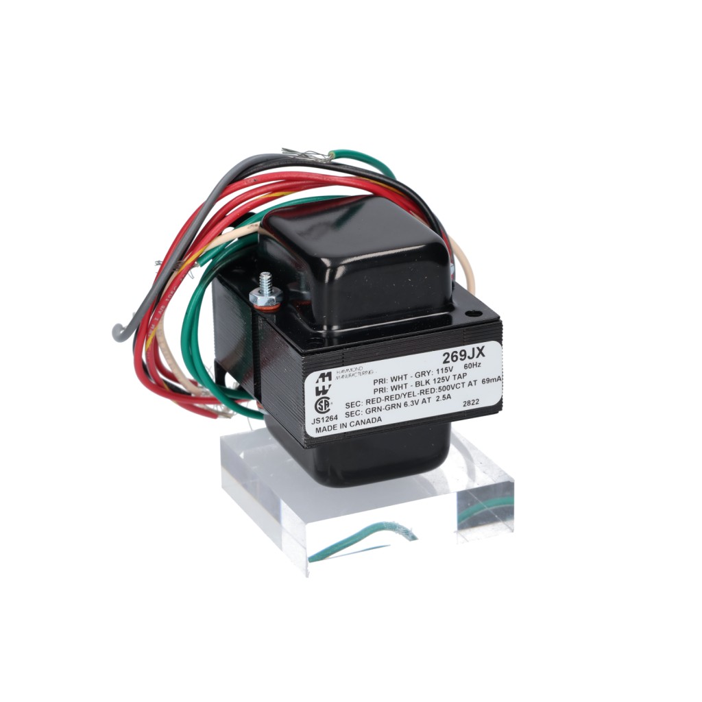 Hammond High Voltage Chassy Mount Power Transformer Primary [115VAC, 50VA @ 60Hz] >> Secondary Filament 1 [6.3V @ 2.5Awith R.M.S. of 500V C.T. @ 69ma.. Overall Dims WidthxDepthxHeight of 2.19 x 2.63 x 2.63. ROHS and CSA.