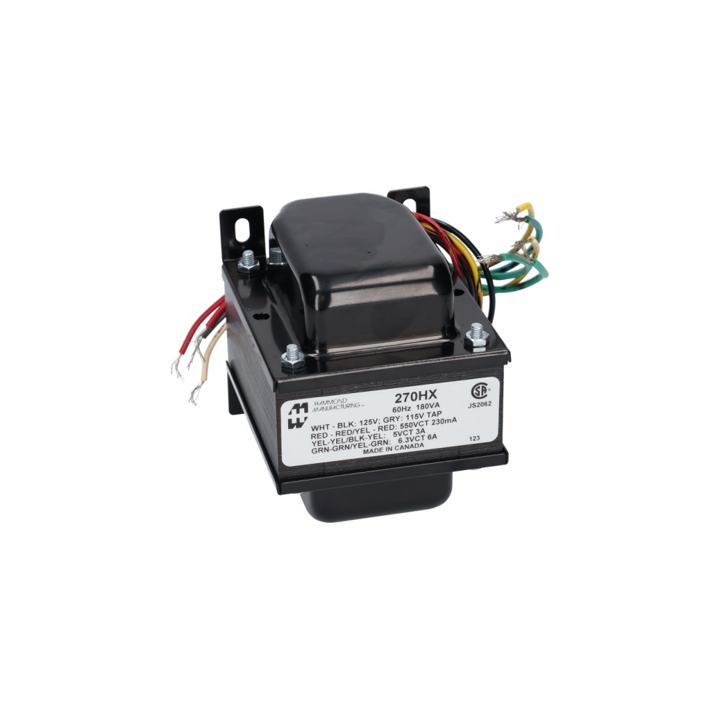 Hammond High Voltage Chassy Mount Power Transformer Primary [115VAC, 176VA @ 60Hz] >> Secondary Filament 1 [5V C.T. @ 3Awith R.M.S. of 550V C.T. @ 230ma.. Overall Dims WidthxDepthxHeight of 3.13 x 4.00 x 3.81. ROHS and CSA.