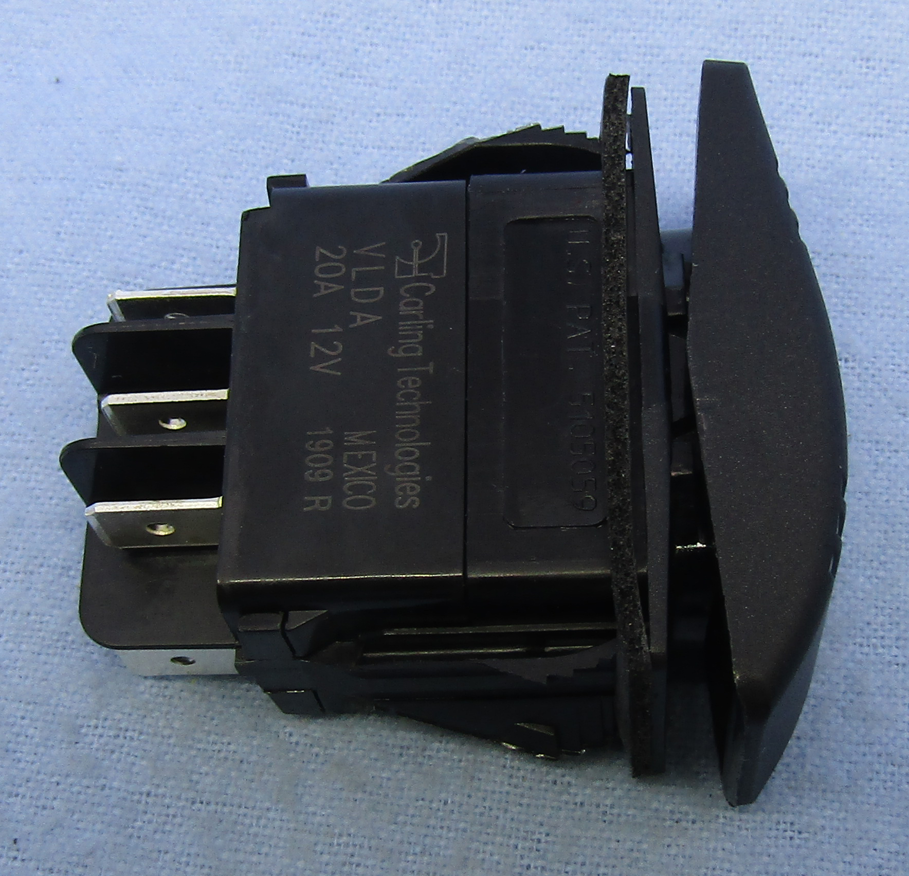 LKG - 30-16570B CARLING PN: VLDAB60C-CMC00-000 Sealed Lighted Rocker Switch DPDT, action: (on) - off - (on) momentary, actuator: black with red lens current rating: 20A @12V DC, IP67 contact material: silver CAD-oxide, silver tin-oxide, fine silver terminal material: brass or copper/silver plate terminal type: .250" quick connect mounting hole: 0.83" x 1.45"