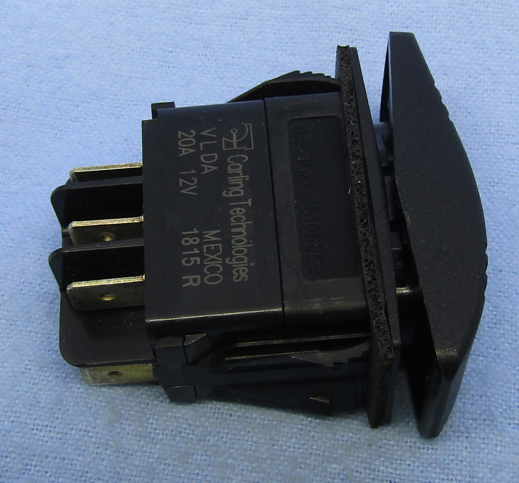 LKG - 30-16575B CARLING PN: VLDAB60C-CTC00-000 Sealed Lighted Rocker Switch DPDT, action: (on) - off - (on) momentary, actuator: black with blue lens current rating: 20A @12V DC, IP67 contact material: silver CAD-oxide, silver tin-oxide, fine silver terminal material: brass or copper/silver plate terminal type: .250" quick connect mounting hole: 0.83" x 1.45"