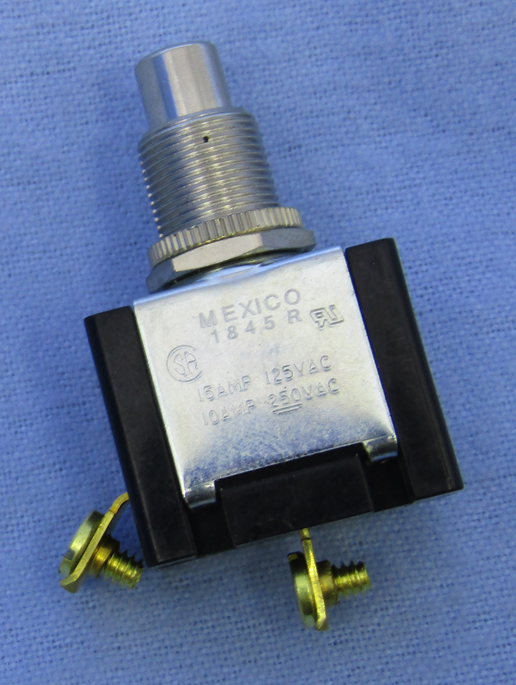 LKG - 30-14455B CARLING PN: PA354 Heavy Duty Push Button Switch SPST, action: on - off actuator: brass/nickel plate, mounting hole: 0.500" current rating: 15A @ 125V AC, 10A @ 250V AC base material: phenolic bushing material: brass/nickel plate terminal type: screw (#6-32NC-2 thread)