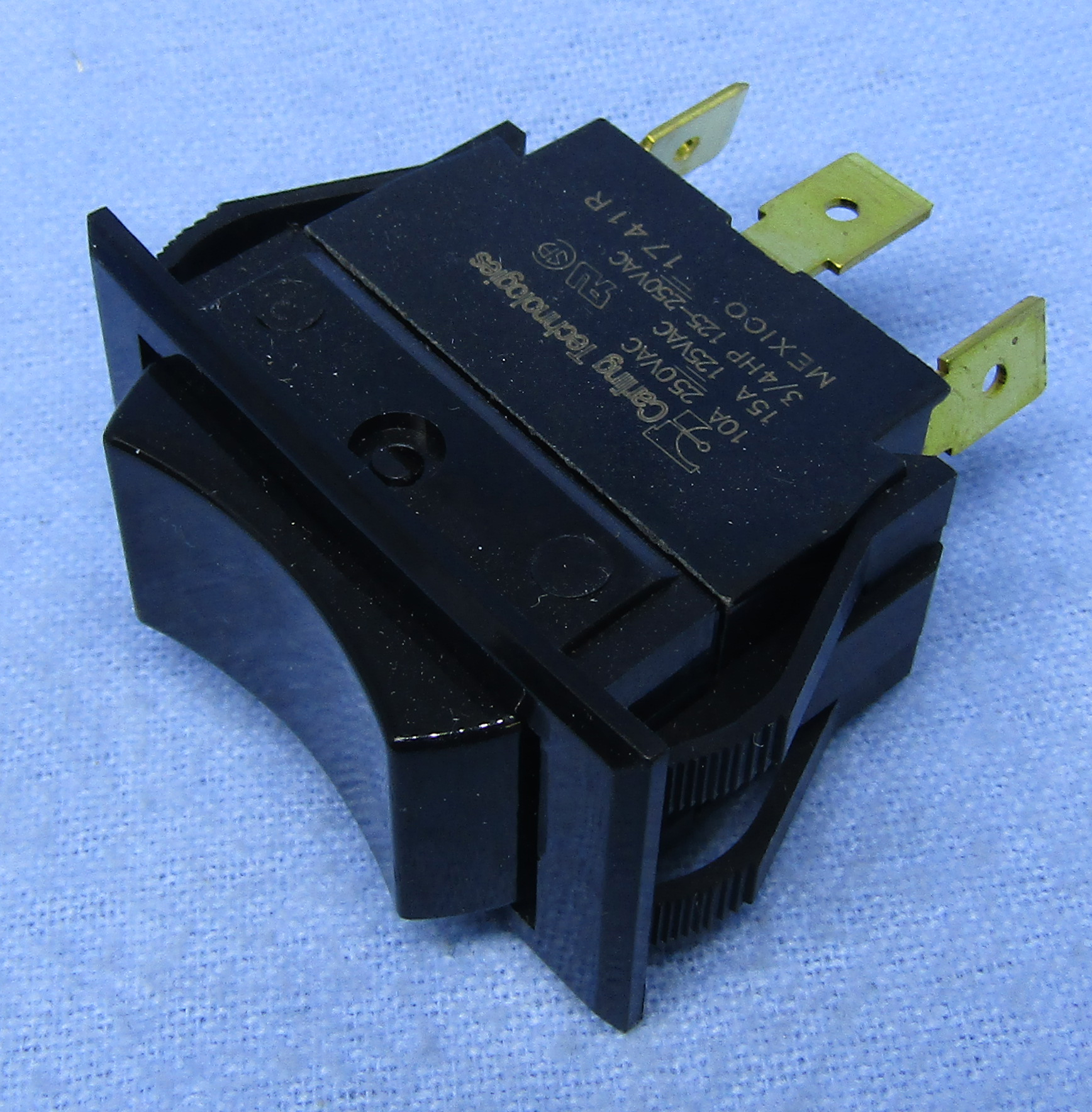 LKG - 30-16620B CARLING PN: TIGC51-6S-BL-NBL AC/DC Heavy Duty Rocker Switch SPDT, action: on - off - on, actuator: black nylon current rating: 15A@125V AC, 10A @250V AC, 3/4HP 125-250V AC base material: phenolic terminal type: .250" quick connect mounting hole: 0.83" x 1.45"