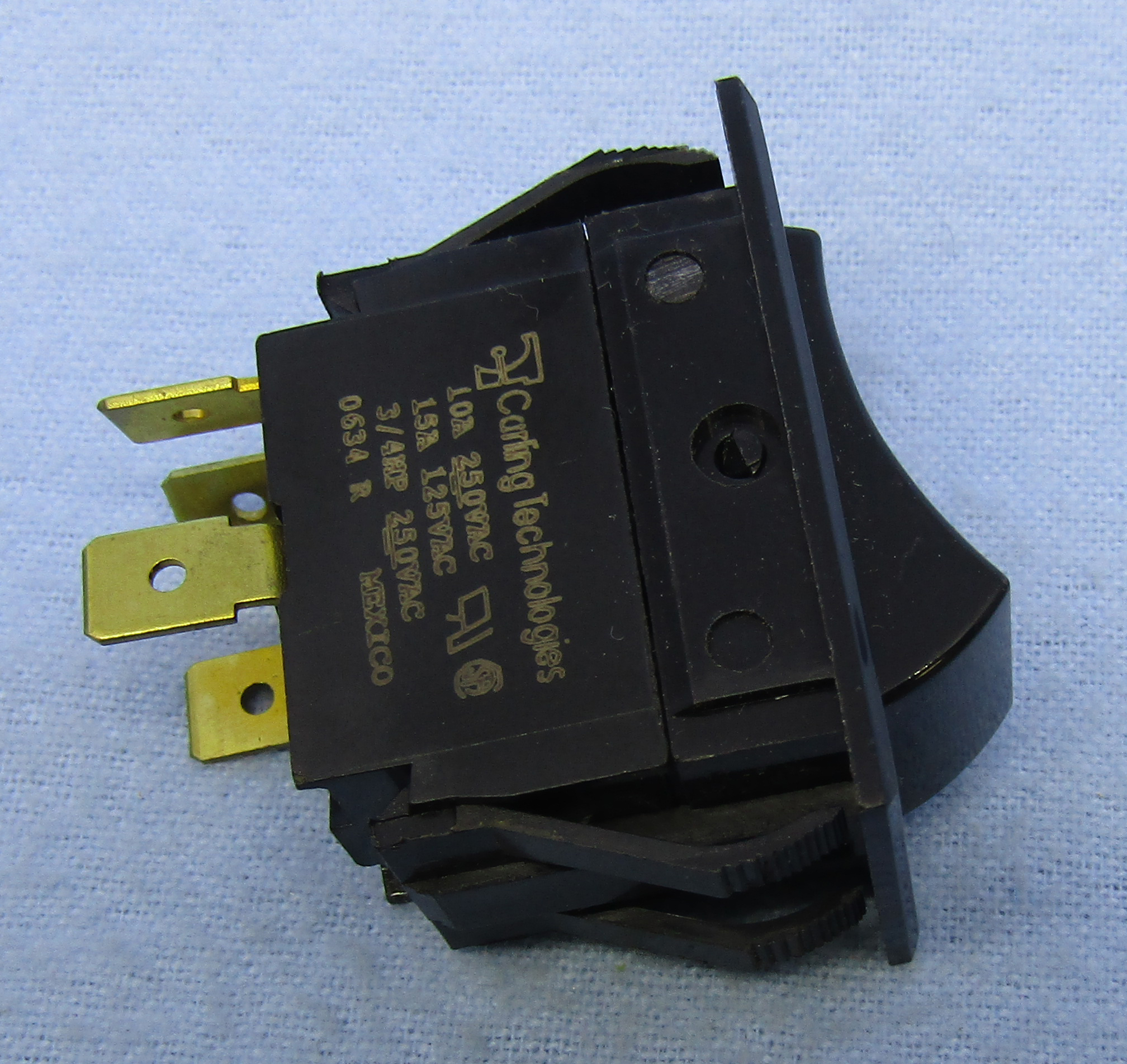 LKG - 30-16660B CARLING PN: TIGK5B-6S-BL-NBL AC/DC Heavy Duty Rocker Switch DPST, action: (on) - off momentary, actuator: black nylon current rating: 15A@125V AC, 10A @250V AC, 3/4HP 125-250V AC base material: phenolic terminal type: .250" quick connect mounting hole: 0.83" x 1.45"