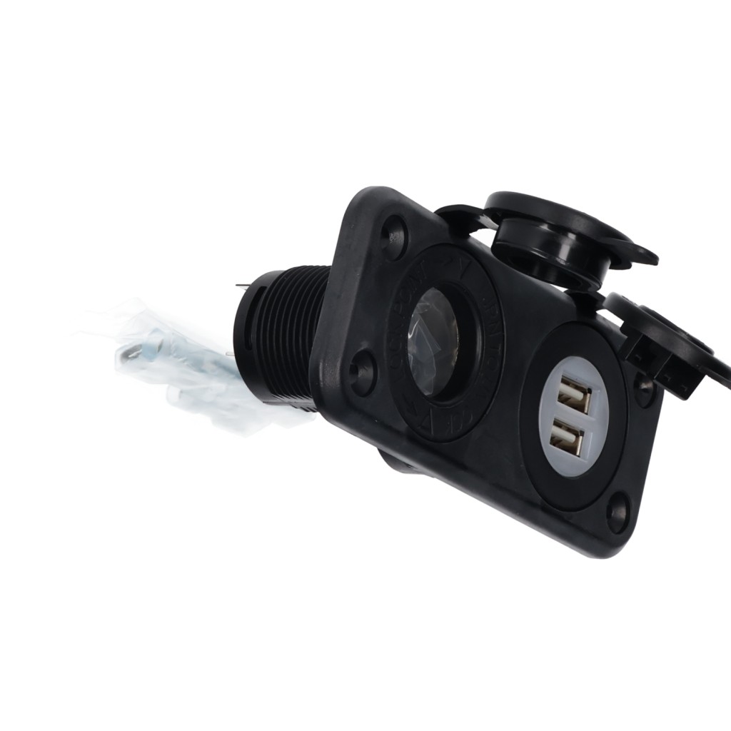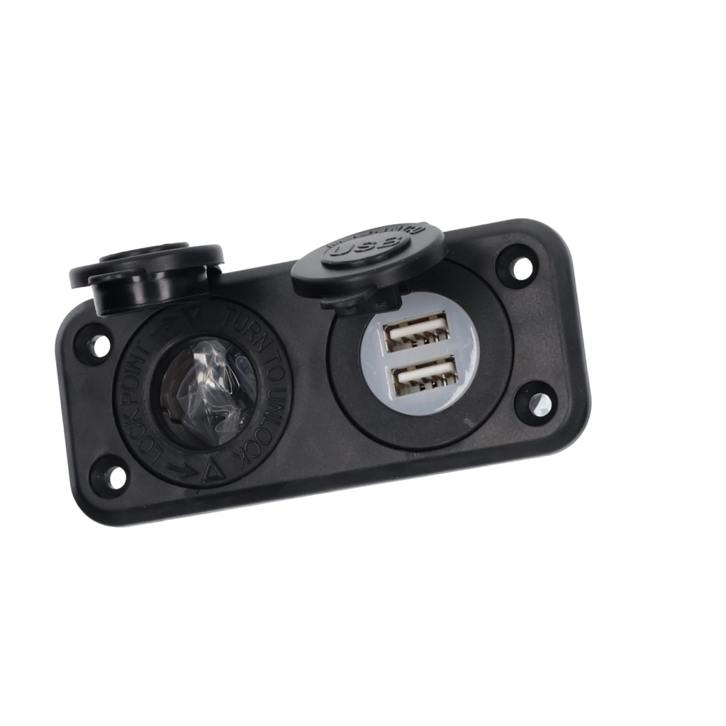 SeaLink Deluxe Dual USB Charger and 12V Receptacle; Marinco introduces combination Dual USB with 12V Receptacle. An expansion of the durable SeaLink 12V product line, the combination Dual USB features two ports to charge cell phones, tablets and other devices powered by USB's, a blue LED to show that power is available, and a cover to prevent water and dirt from entering the ports. The Dual USB has a 12 to 24 Volt input with a 5 Volt output, a total of 2.1 amps output between the two ports. The