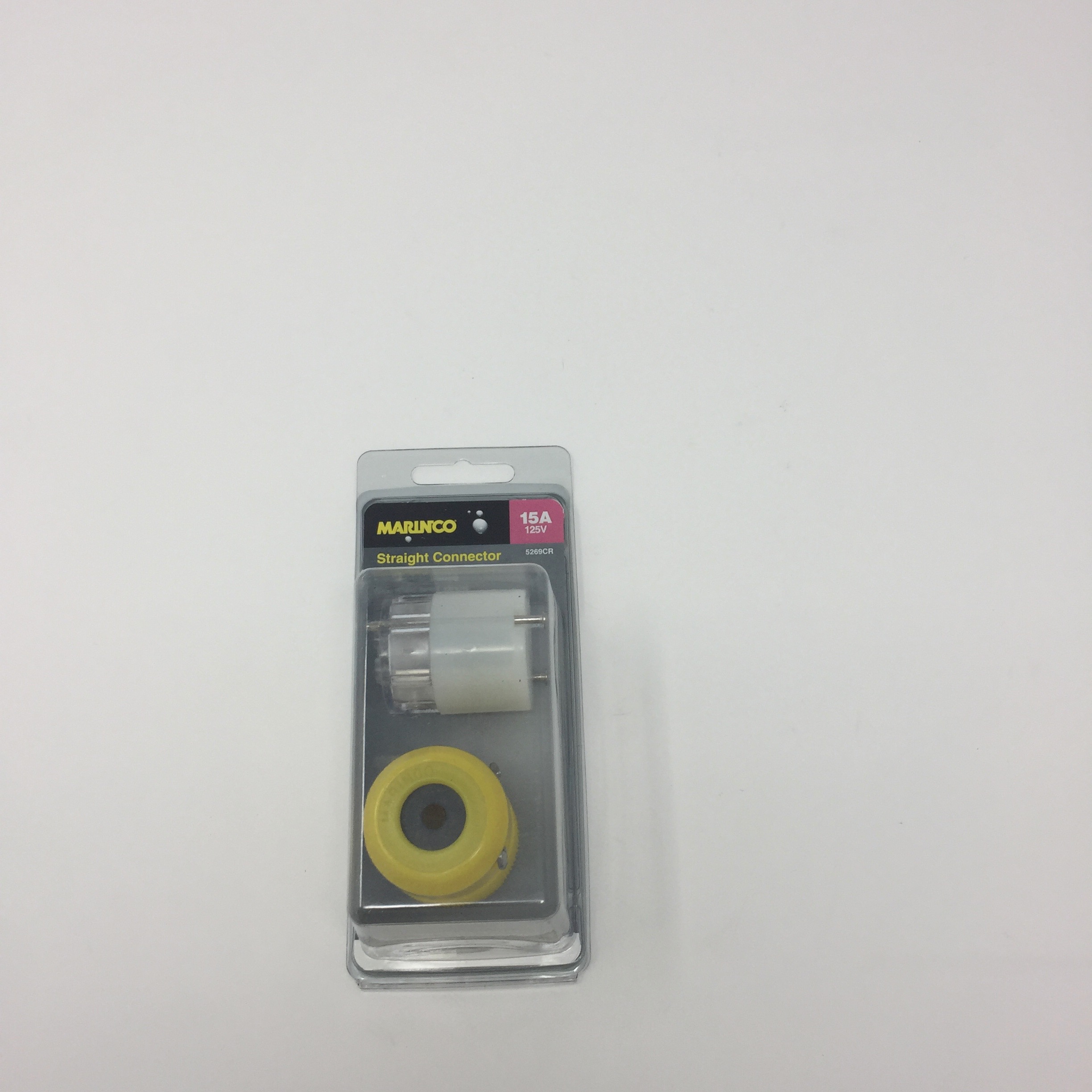 15A 125V Female Connector; The 5269CR 15A 125V straight blade female shore power connector features corrosion resistant contacts and terminals. The body is made of yellow nylon with a ribbed design for secure grip.