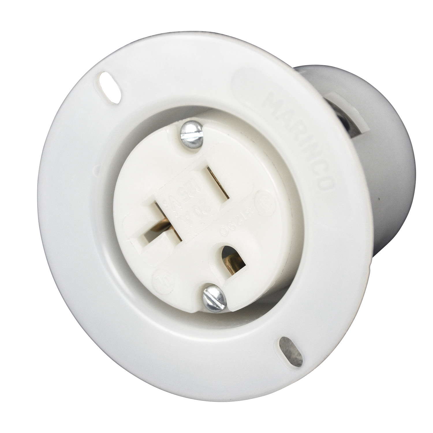 20A 125V 2P 3W (5-20R) Flanged Outlet - White Body in a Black Housing; Marinco offers a full line of industry specific products with the Marinco tradition of innovative design and customer response. Many features and benefits are universal to all Marinco brand products.