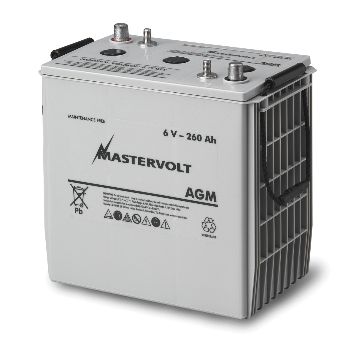 Mastervolt 6/260 Ah AGM Battery; In AGM batteries, the electrolyte (mixture of water and sulphuric acid) is largely absorbed in glass fibre. This type of battery is entirely maintenance-free and there is no gas formation with normal use. Not requiring any ventilation, these batteries can be installed anywhere. Their construction gives a very fast discharge at very high currents so AGM batteries are ideal for systems that require high currents (for instance when starting an engine). The battery poles can be unscrewed and this type of battery can be combined with every standard battery terminal.