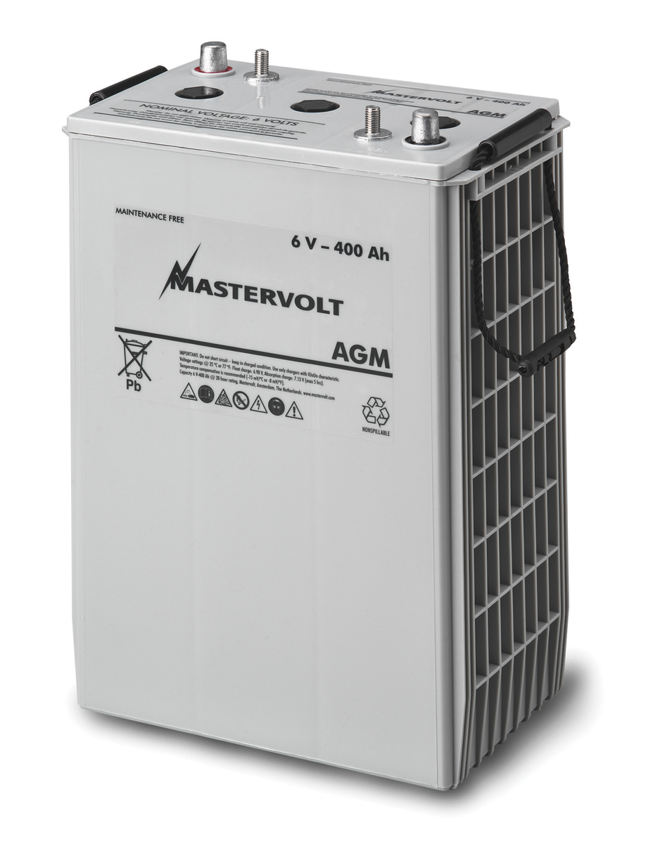 Mastervolt 6/400 Ah AGM Battery; In AGM batteries, the electrolyte (mixture of water and sulphuric acid) is largely absorbed in glass fibre. This type of battery is entirely maintenance-free and there is no gas formation with normal use. Not requiring any ventilation, these batteries can be installed anywhere. Their construction gives a very fast discharge at very high currents so AGM batteries are ideal for systems that require high currents (for instance when starting an engine). The battery poles can be unscrewed and this type of battery can be combined with every standard battery terminal.