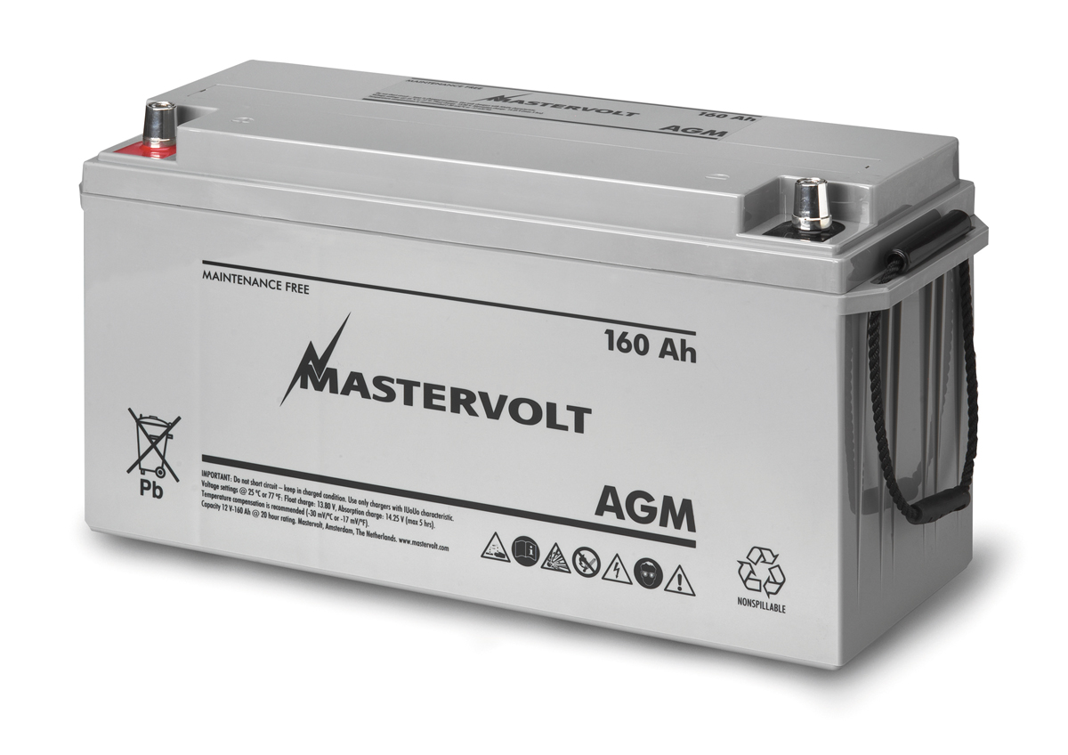 Mastervolt 12/160 Ah AGM Battery; In AGM batteries, the electrolyte (mixture of water and sulphuric acid) is largely absorbed in glass fibre. This type of battery is entirely maintenance-free and there is no gas formation with normal use. Not requiring any ventilation, these batteries can be installed anywhere. Their construction gives a very fast discharge at very high currents so AGM batteries are ideal for systems that require high currents (for instance when starting an engine). The battery poles can be unscrewed and this type of battery can be combined with every standard battery terminal.
