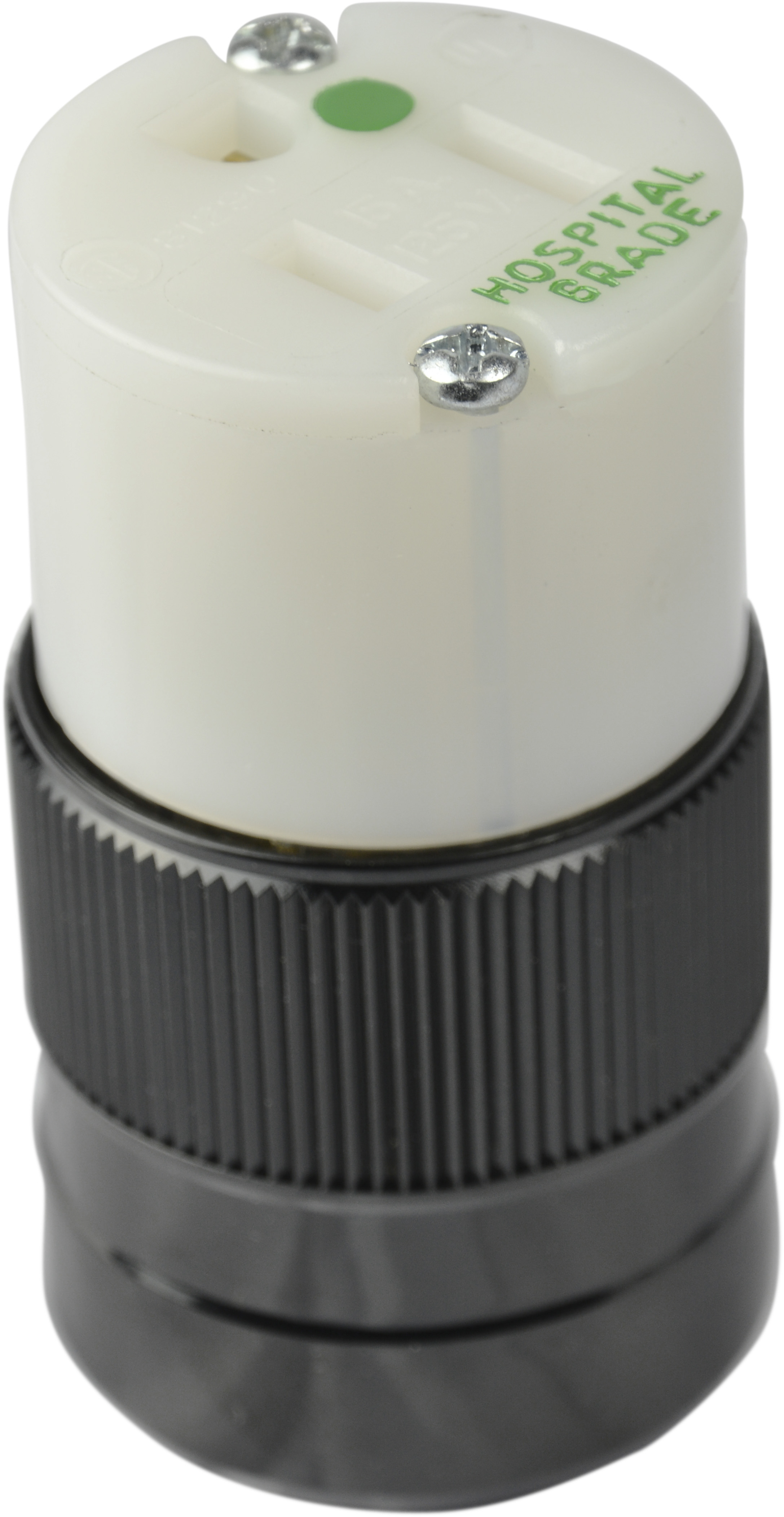 15A 125V 2P 3W (5-15R) Hospital Grade Connector - White Body in a Black Housing; These "green dot" devices have been rigorously tested for grounding reliability, assembly integrity, strength and durability. All devices conform to UL Standards for hospital equipment #498 and #544 and meet or exceed Hospital Grade UL tests.