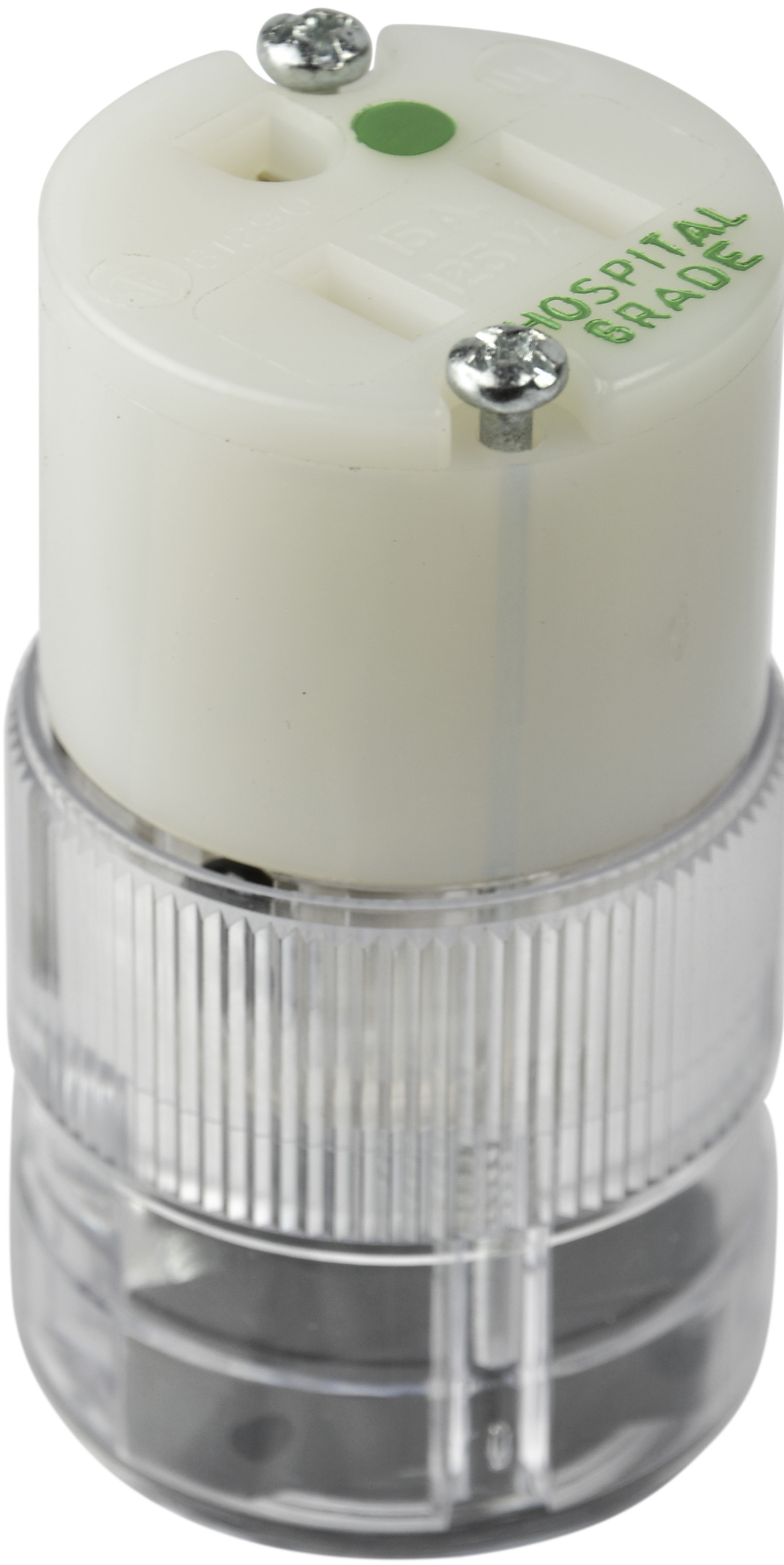15A 125V 2P 3W (5-15R) Hospital Grade Connector - Black Body in a Transparent Housing; These "green dot" devices have been rigorously tested for grounding reliability, assembly integrity, strength and durability. All devices conform to UL Standards for hospital equipment #498 and #544 and meet or exceed Hospital Grade UL tests.