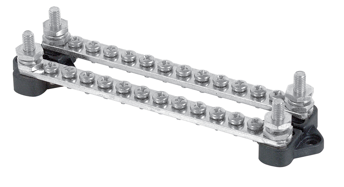 Multi Purpose Bus Bar, 12 Way/100A x 2 - No Cover; These bus bars have tin-plated, brass-insulated mounting bases with recessed mounting holes to avoid accidental shorts on aluminum surfaces.