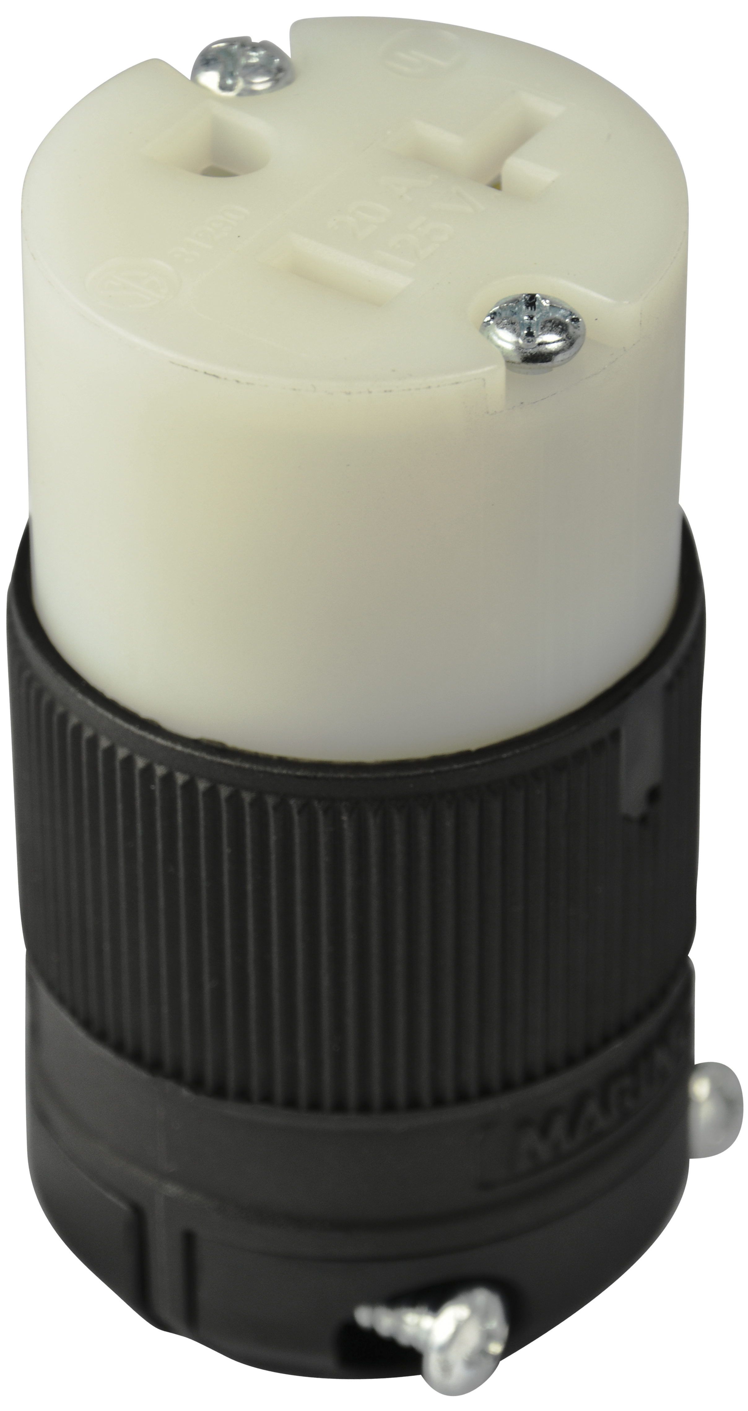 20A 125V 2P 3W (5-20R) Clamp-Lock Connector - White Body in a Black Housing; The Clamp-Lock termination system provides a maintenance-free connection. This revolutionary system actually gets stronger as the cable is pulled, which provides peace of mind knowing this durable trouble-free solution can handle heat, shock and vibration. Most important, Clamp-Lock enables wiring termination up to 50 percent faster than conventional screw termination products resulting in a more cost-effective process