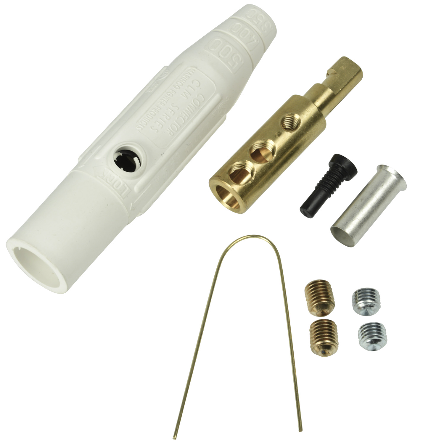 CLM Series Inline Single Pin Connectors (150A / 600V) #8 - #2 AWG Male - White (B); CLM Series inline connectors have a non-conductive retaining screw which passes through the metal contact and fastens at both ends to the retaining ring, providing maximum resistance to excessive torque loading.