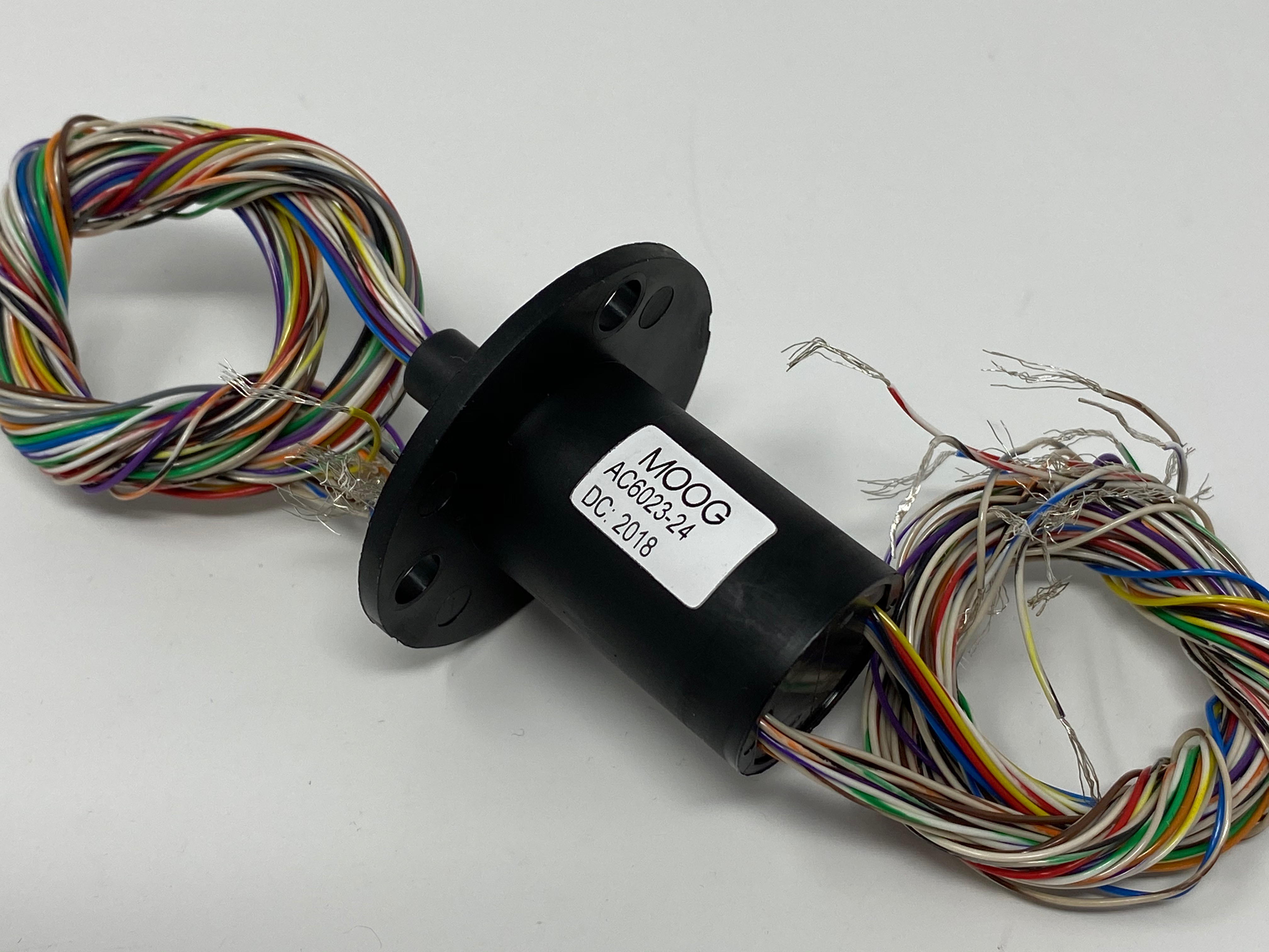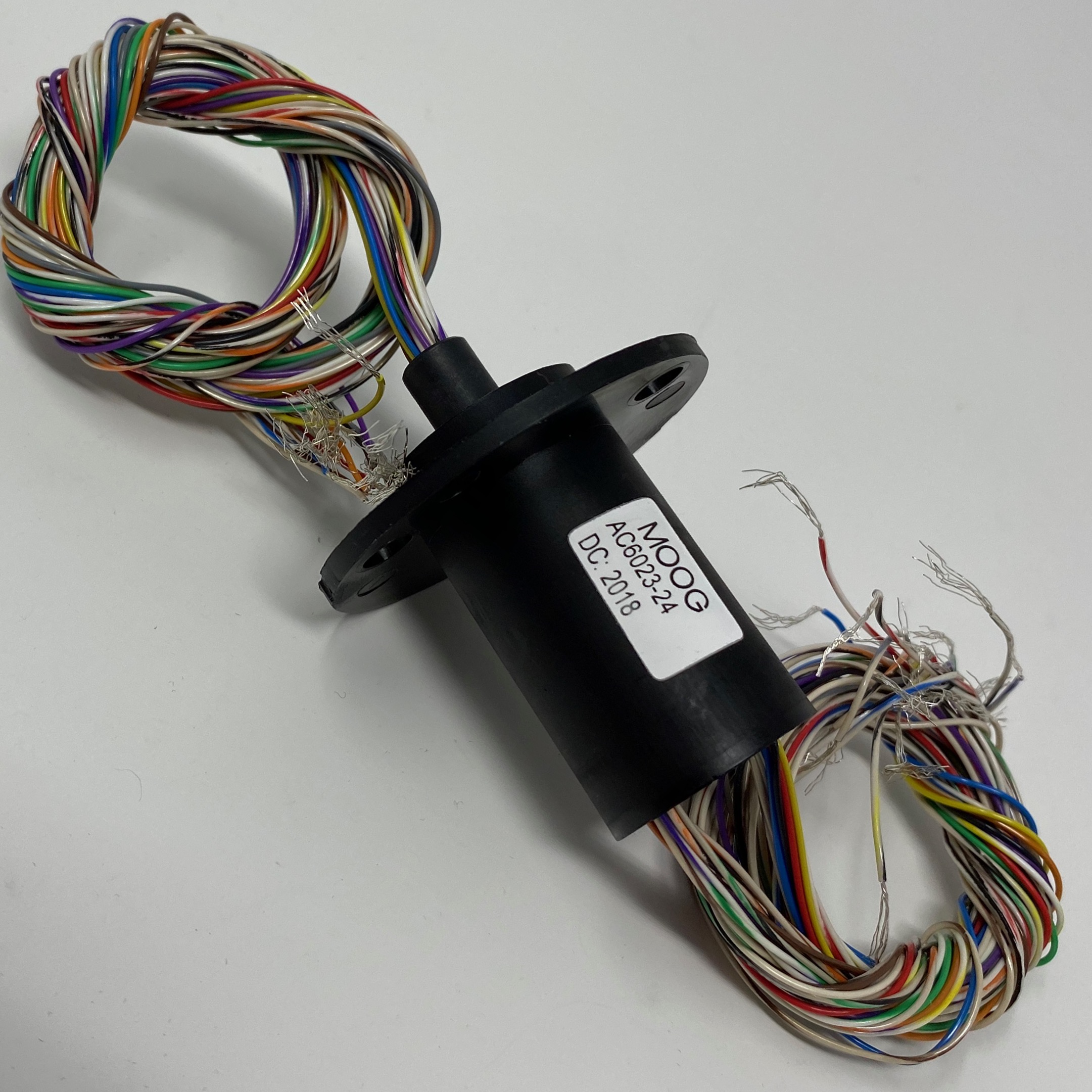 Moog Compact Capsule Slip Ring with 24 x 2 Amp / 240 VAC circuits. Precision ball bearings design. 12 Inch Lead Length with Plastic Flanged Housing and Gold Contacts. Operating Speed up to 250 RPM (updated 4/4/23)
