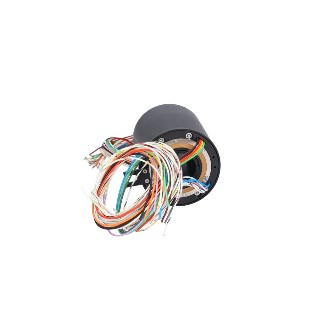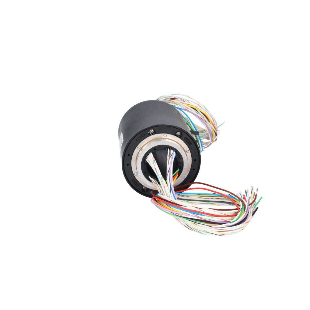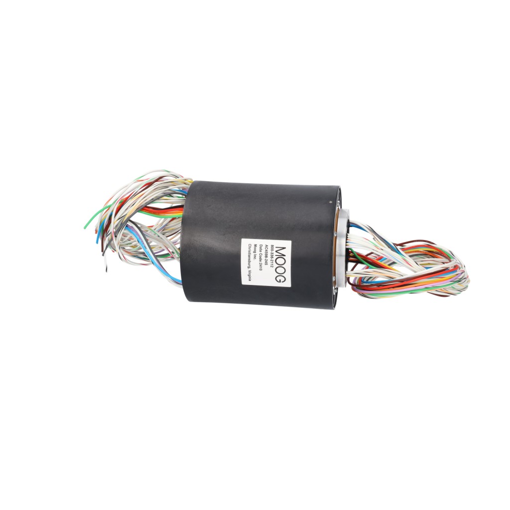 Moog 1-1/2 Inch Through Bore Slip Ring with 24 x 10 Amp / 600 VAC circuits with Unique fiber brush technology design. 12 Inch Lead Length with Operating Speed up to 250 RPM Flanged Not IP65