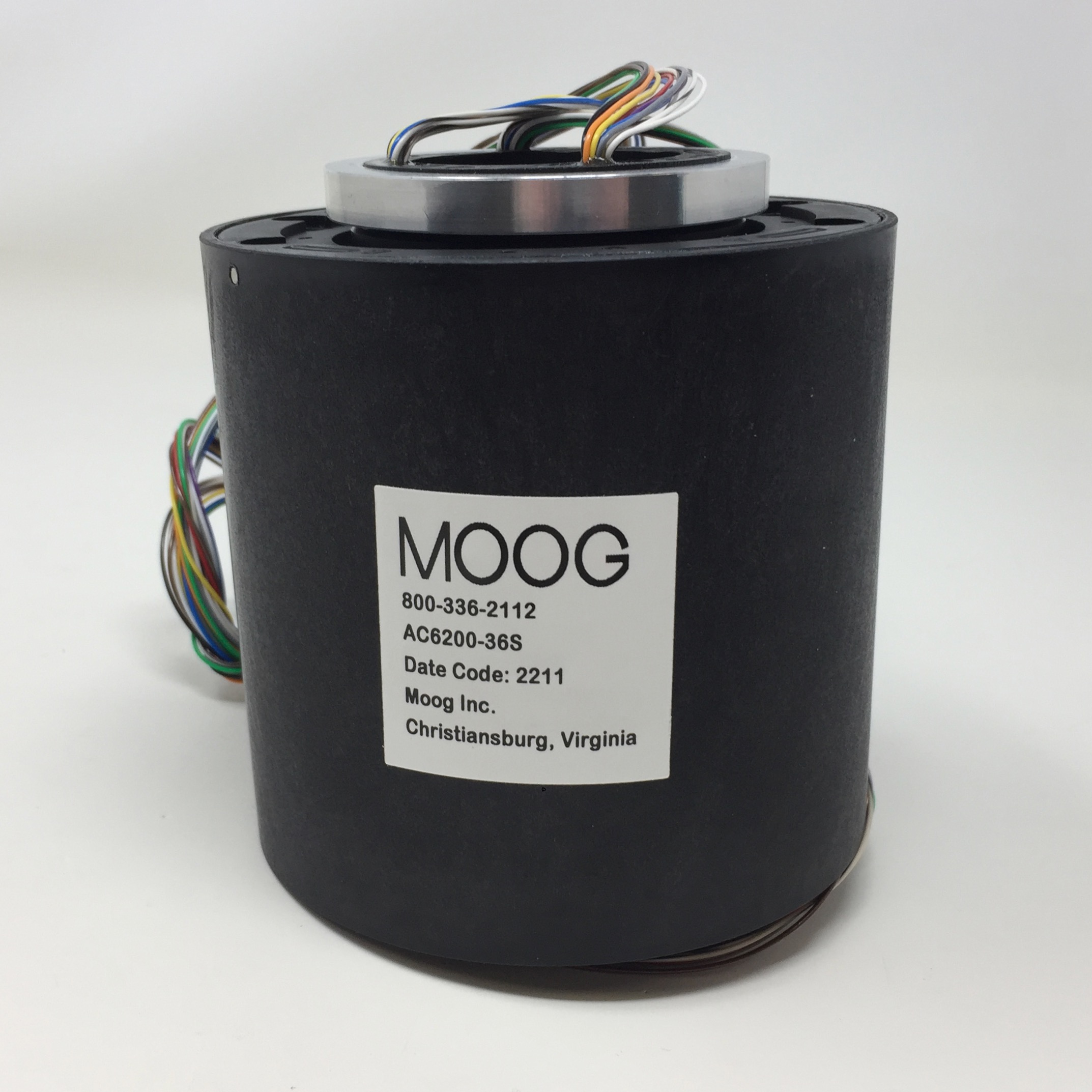 Moog 1-1/2 Inch Through Bore Slip Ring with 36 x 2 Amp / 240 VAC circuits and Unique fiber brush technology design. Overall Dims of (3.9 Inch Dia. x 4.01 Inch Depth) with 12 Inch Lead Length and Operating Speed up to 250 RPM Not IP65