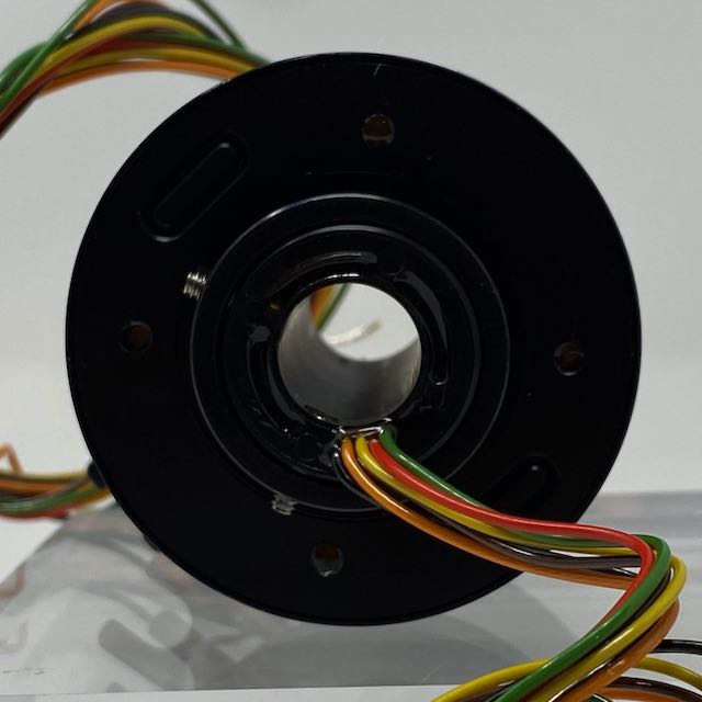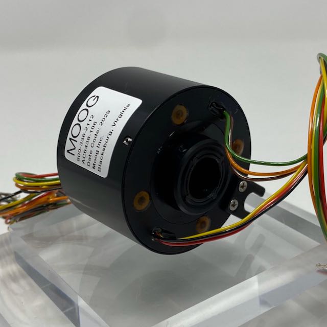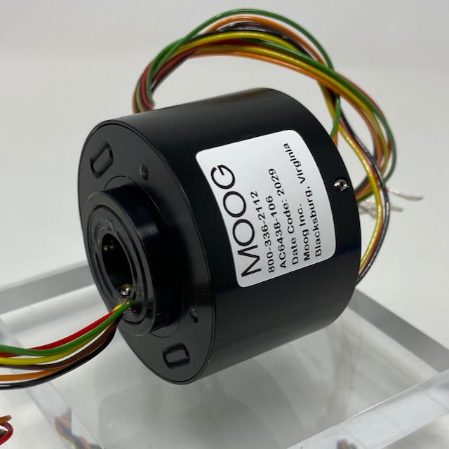 Moog 1/2 Inch Minature Through Bore Slip Ring with 6 @ 5 Amp / 240 VAC circuits using Gold Plated Rings and Unique fiber brush technology design . High-impact thermoplastic Body with Overall Dims of (2.1 Inch Dia. x 1.55 Inch Depth) and 12 Inch Lead Length. Operating Speed up to 250 RPM