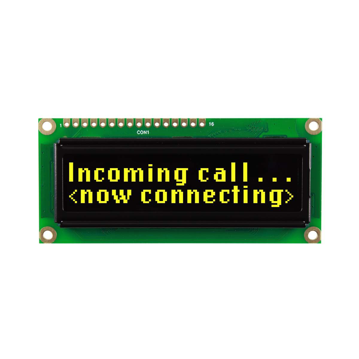Newhaven Character OLED Display with Display Format 2 x 16 with 5.55 x 2.95 Character size Using Parallel / 3 wire SPI Interface Full Part Number: NHD-0216KZW-AY5
