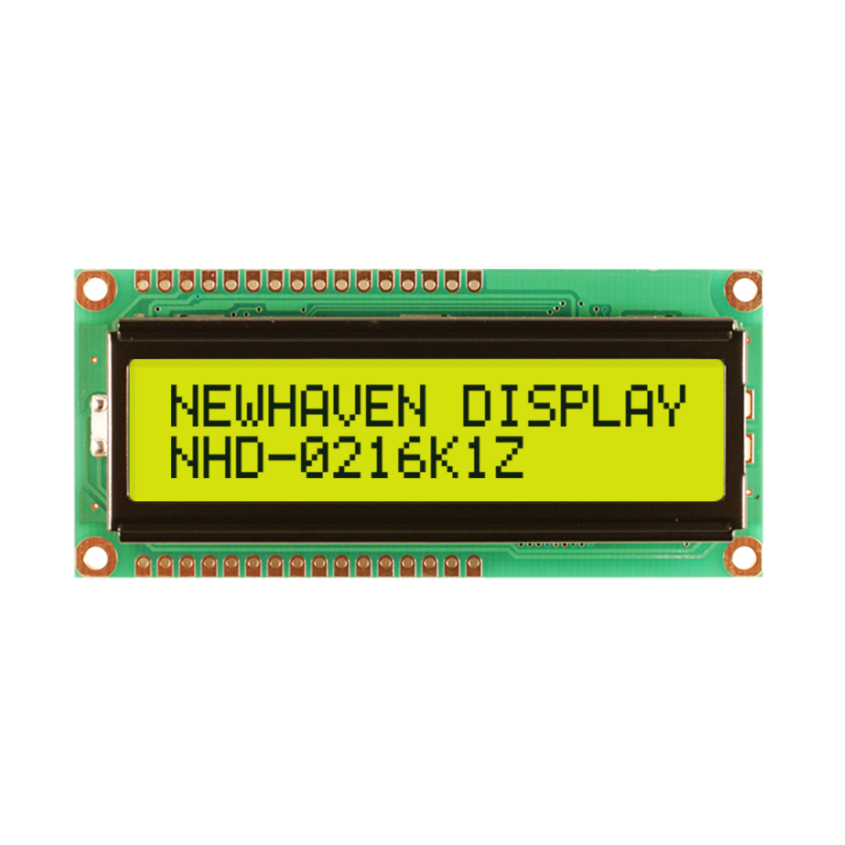 Newhaven 2 x 16 Characters Transflective LCD Character Display @ 5V and 8-Bit Parallel Interface with 1x16 Top/Bot Connector and SPLC780D OR ST7066U Controller. PN - NHD-0216K1Z-FL-YBW
