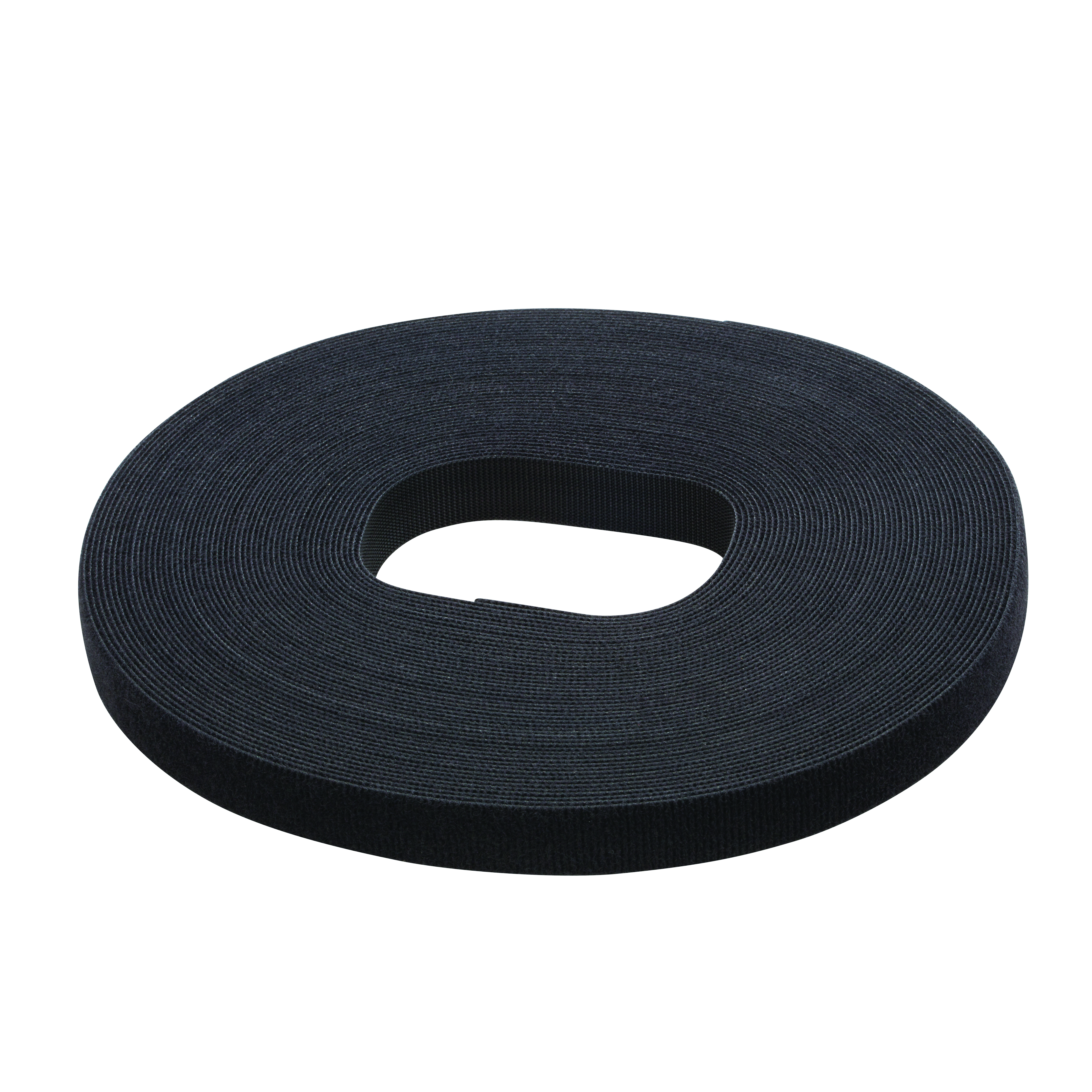75-ft Black hook and loop fastener Cable Ties - 1 Piece hook and loop fastener Cable Ties offer a unique back-to-back fastening system: a self-gripping; double-sided strap that is easy to use and cost effective. They feature a molded high performance polyethylene hook fastener laminated on to a non-woven polyester loop. The low peel strength allows for easy entry or removal by the user yet the average shear strength is 3.0 psi; which increases substantially with each circular rotation. Will not