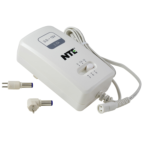 57-U2 NTE | adapters_10 | Wall Transformer Factory Lead Time: TBD RoHs Compliant AC-DC ADAPTER UNIVERSAL 3,5,6,7.5,9,12VDC @ 2.5A INCLUDES STRAIGHT AND RIGHT ANGLE 2.1MM X 5MM TIPS $112.20 Quantity Min: 1 Mult: 1