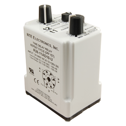 R26-11AD10-U NTE | R26 | Relays Total Stock: 1 Factory Lead Time: TBD RoHs Compliant RELAY-DPDT PROGRAMMABLE TIME DELAY 24-240VAC PLUS 12-125VDC REPEAT CYCLE 8-PIN OCTAL 16 TIME RANGES $704.30 Quantity Min: 1 Mult: 1