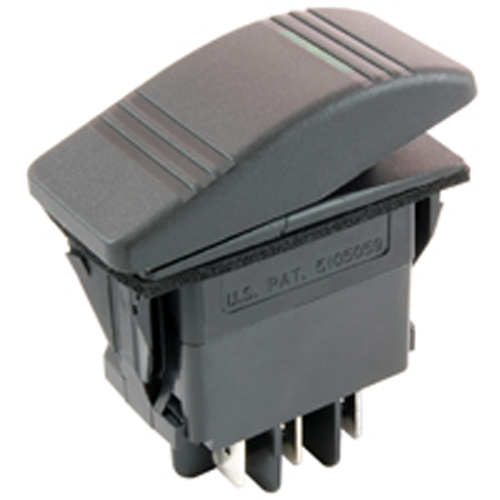 NTE SWITCH ROCKER ILLUMINATED SNAP-IN DPDT 20A 12VDC ON-OFF-ON W/GREEN LENS .25 QC TERM AUTO/MARINE PART-NUMBER 54-036