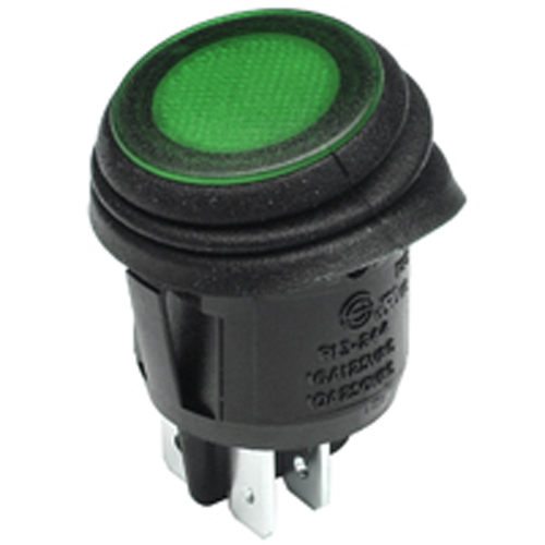 NTE ROCKER SWITCH WATERPROOF ILLUMINATED ROUND DPST 16A ON-NONE-OFF GREEN 110V NEON LAMP .187 QC TERM PART-NUMBER 54-209W